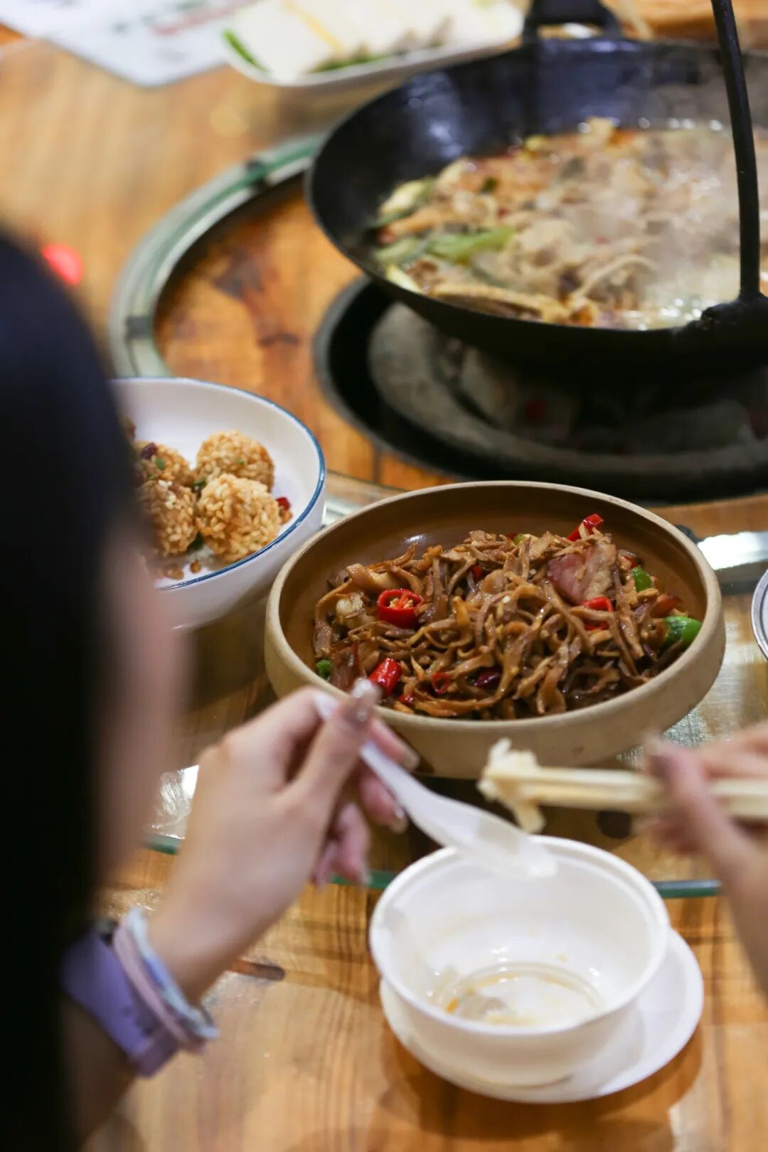 吃吊锅千万别忘了配上他们家招牌绿豆粉。作为地道的土家美食,不同于滑溜入口的苕粉,绿豆粉微韧弹牙,待到时间让绿豆粉挂足汤汁,一个吸溜,满口知足。