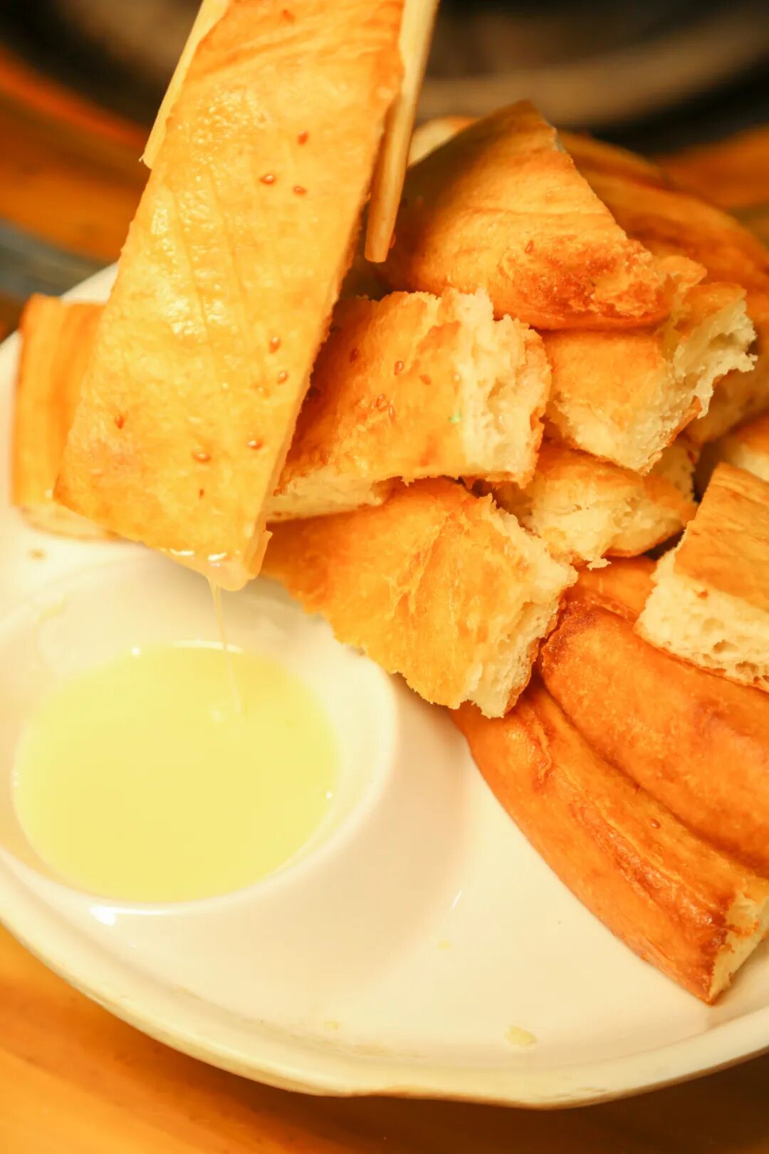 对于资深吃货来说,一盆吊锅当然远远不够。土家火烧馍永远是不可或缺的必选项,外壳薄脆,内里蓬松软和,沾上搭配的炼乳,甜腻与脆软在口腔反复横跳。如果在吊锅汤里短暂浸泡,一口咬下,既有汤的浓郁,又有馍的酥脆,别有一番风味。
