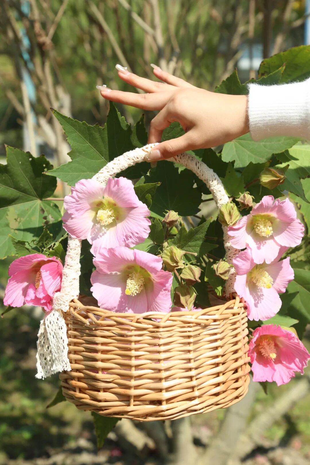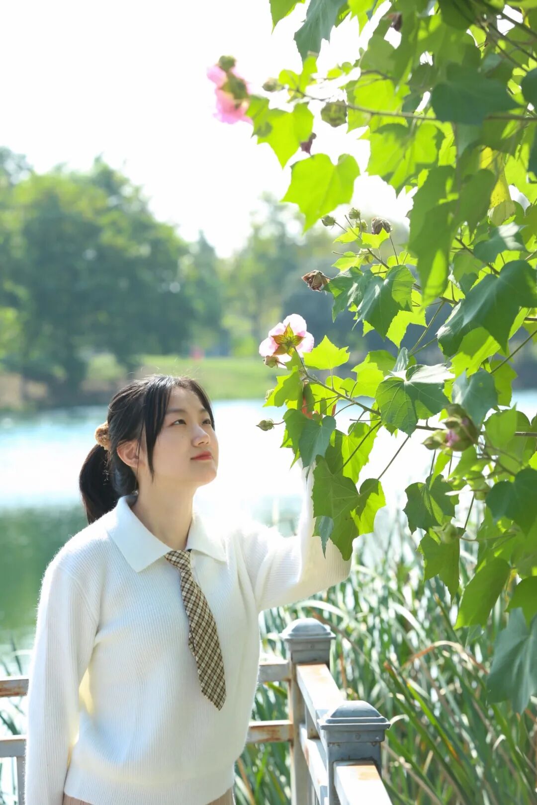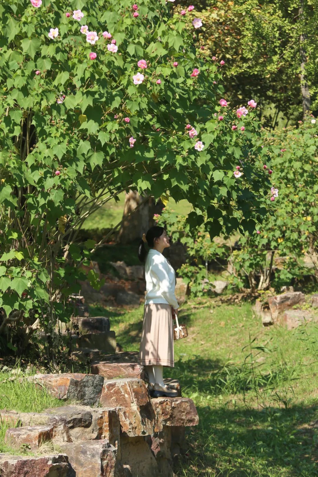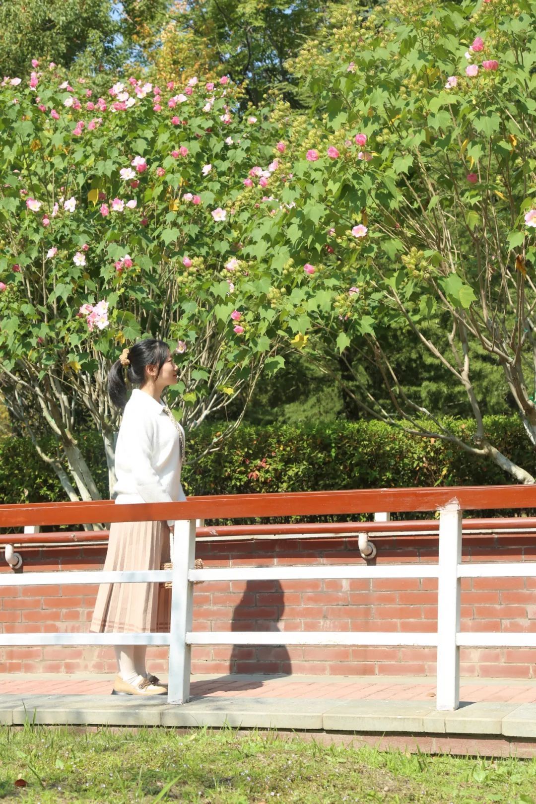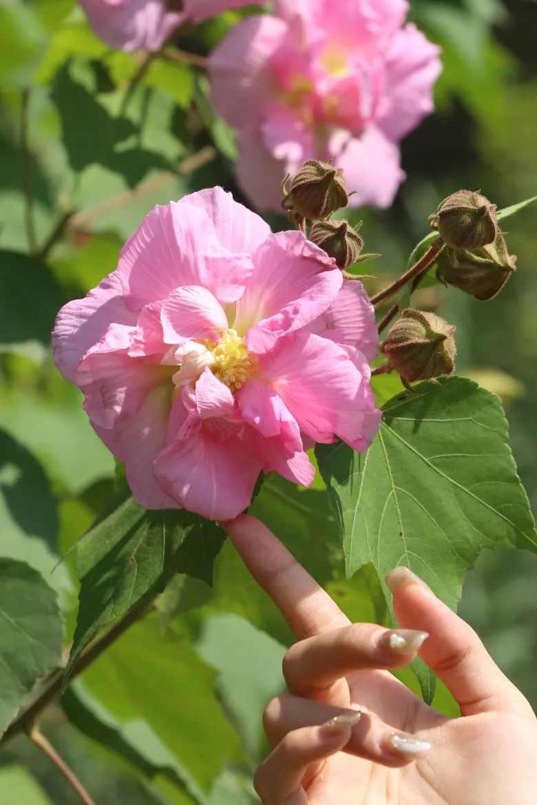 盛开的木芙蓉下,她们摆出最美的pose,言笑晏晏,比木芙蓉的美还具有感染力。