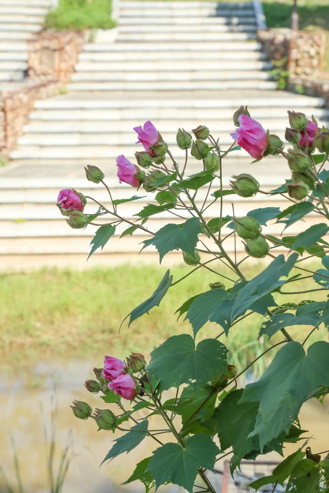 水边的木芙蓉,露染燕脂色未浓。亲水造景映衬着木芙蓉诗意浓浓,石头堆砌的台阶为让人更加接近自然,近距离观赏邻水而立的木芙蓉,陶醉在一片芬芳中。
