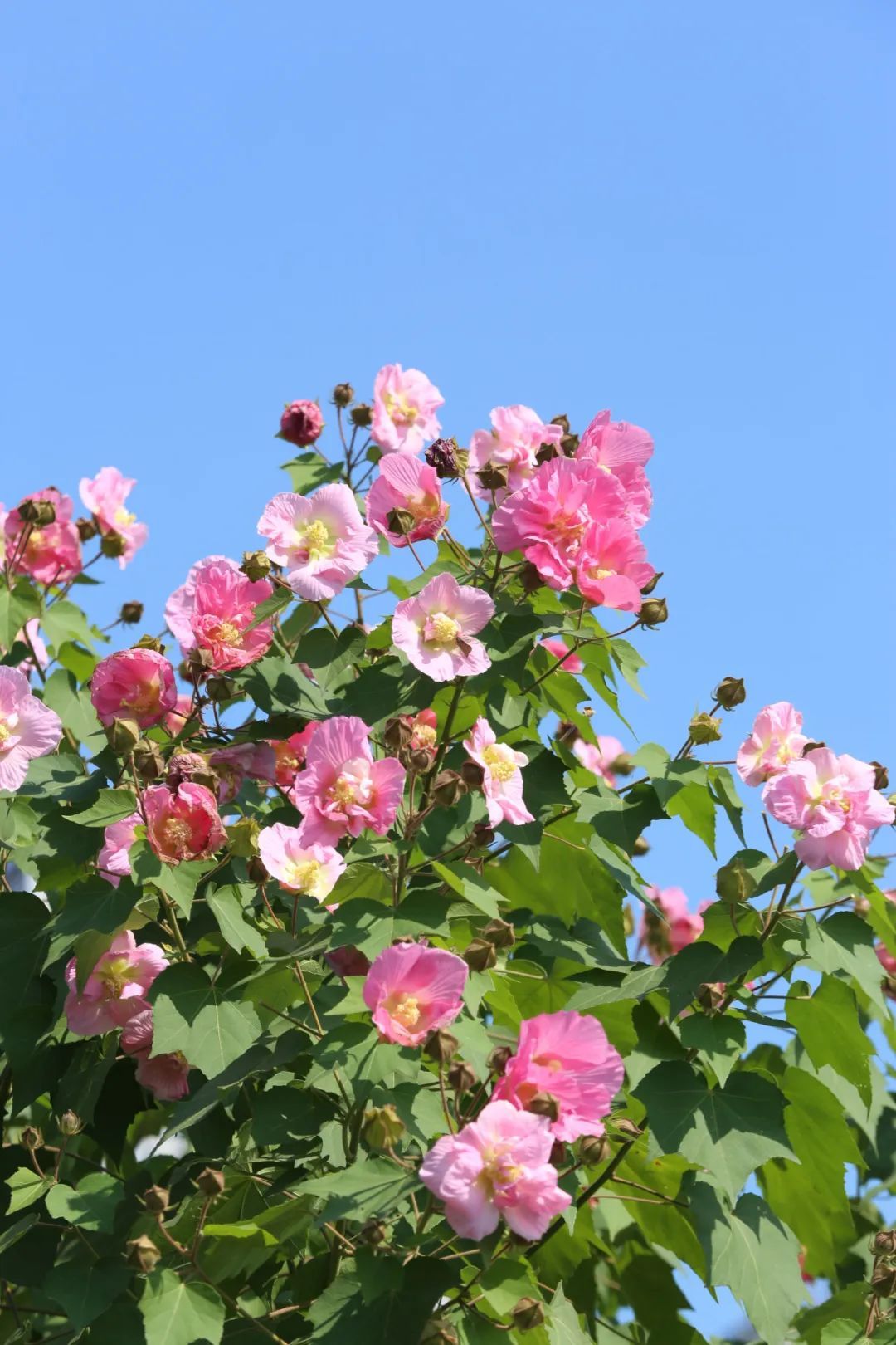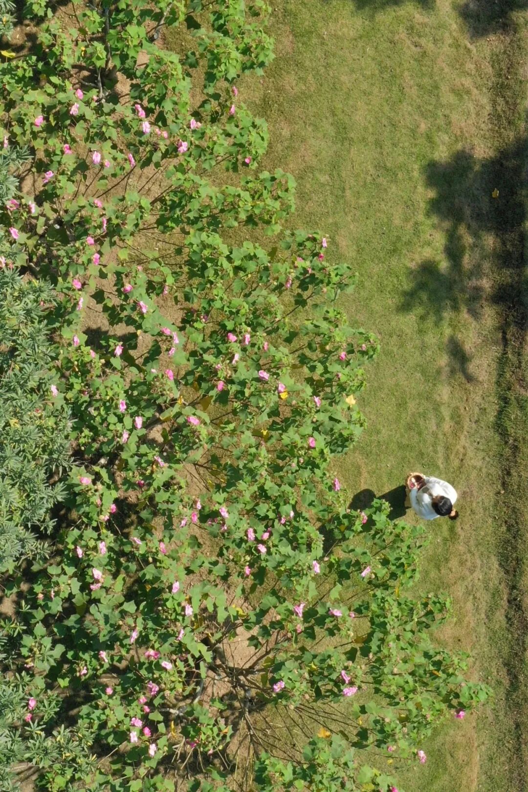向上生长的木芙蓉和隐秘的小道组合成木芙蓉花境,抬头仰望,天蓝蓝,花灿灿。