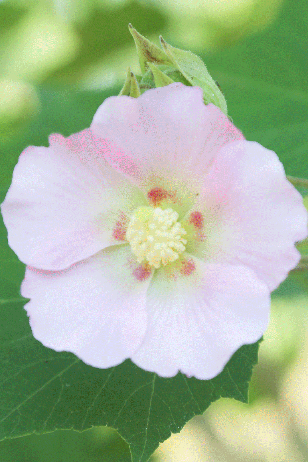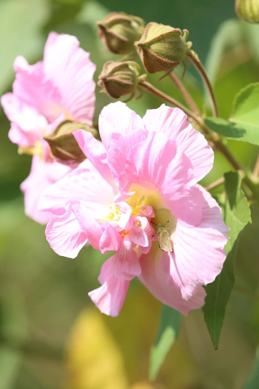 花开一日,花色三弄,木芙蓉这位美人“一日三面”。清晨初开放为淡淡的粉白色,午时变为粉色,傍晚颜色最深,呈深粉色。