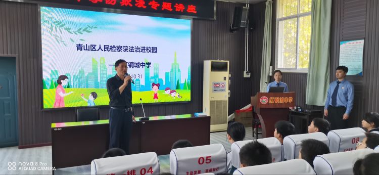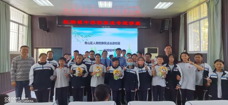 为进一步提高青少年学生的法制观念和法律素养,推动平安校园建设,促进学校法制教育的深入开展,引导同学们知法、懂法、守法,2023年10月31日下午,武汉市红钢城中学法治副校长——青山区人民检察院李静检察官走进校园,开展“珍惜青春 远离校园欺凌”法治专题教育讲座。