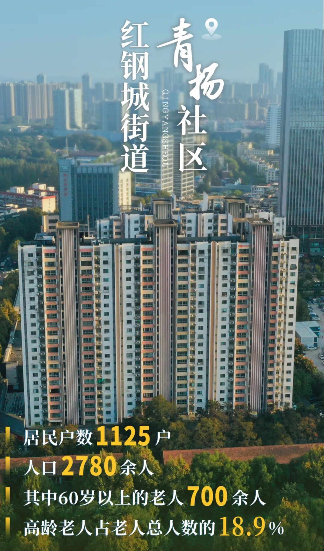 青扬社区地处红钢城中心地段,东起建设八路,西至建设七路,南起和平大道,北至九街社区,是2010年兴建的小区。这里人文环境浓郁、交通条件便利、区域位置得天独厚,是十分理想的“居家养老”地点。