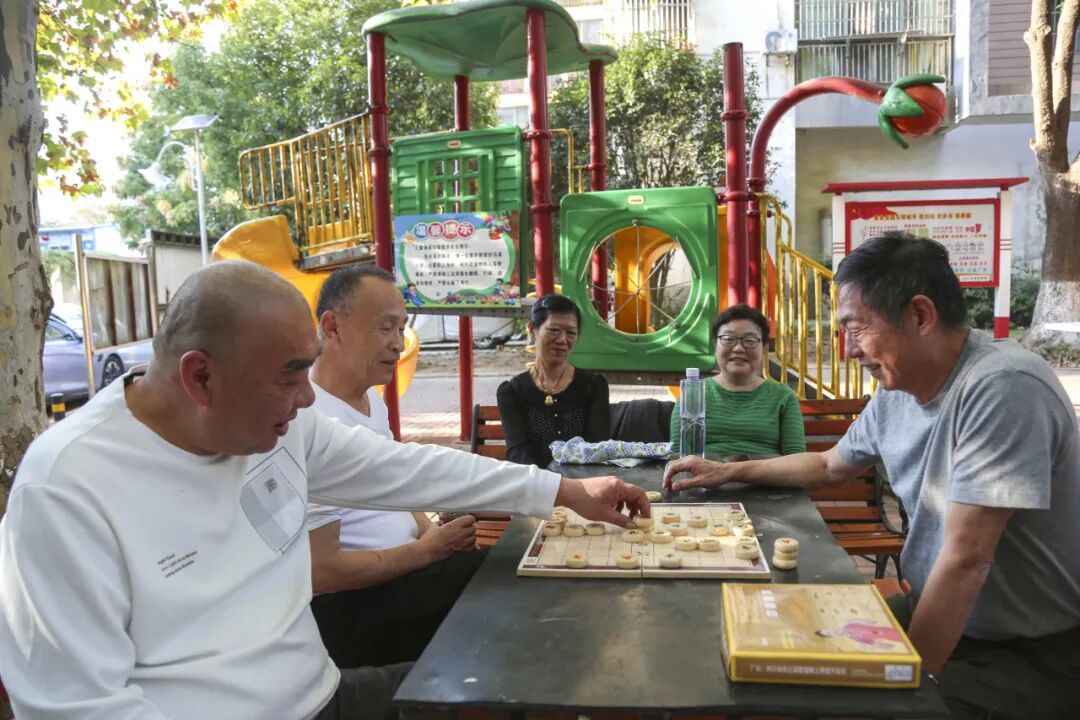 社区小广场上,熊爹爹和胡爹爹刚刚结束一盘象棋,熊爹爹笑呵呵地说道:“我退休后就爱下棋,下象棋不仅动手更动脑,还能以棋会友,给生活增添了不少乐趣,感谢社区给我们提供了下棋交友的平台。”