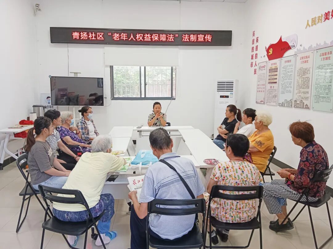 青扬社区同时还广泛开展《老年人权益保障法》等一系列老年人的法律法规宣传教育,举办知识讲座,开设法律教育课,为老年人提供民事调解、法律咨询、法律援助等司法服务,切实维护老年人在赡养、财产、婚姻等方面的合法权益。