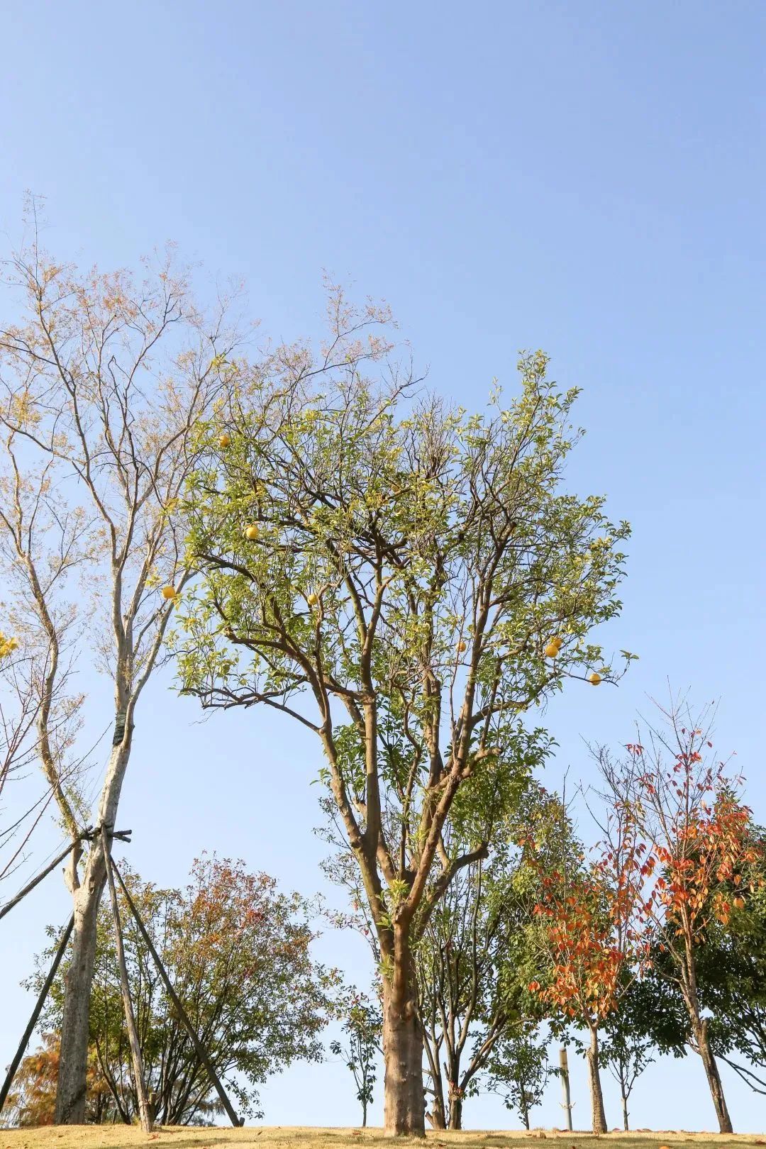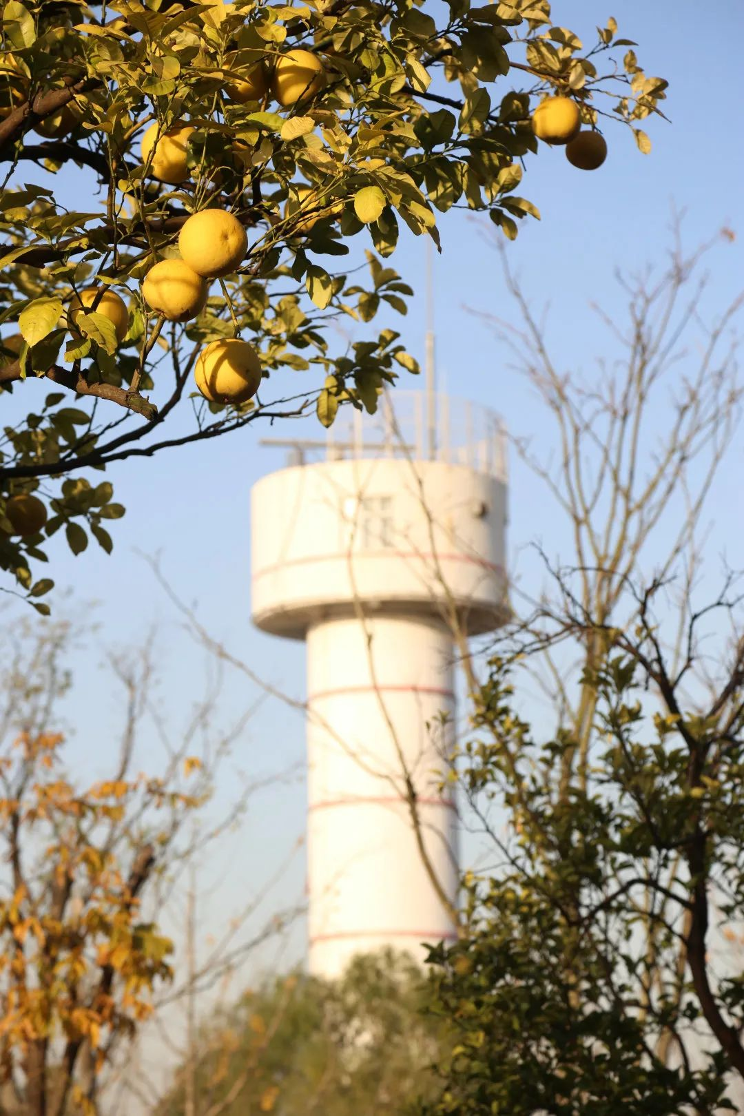 每年到了深秋,南干渠游园总是清芬袭人的。走在树林旁边,便可闻到淡淡的橘子清香,如若走入这片林子,香气便更加明显。