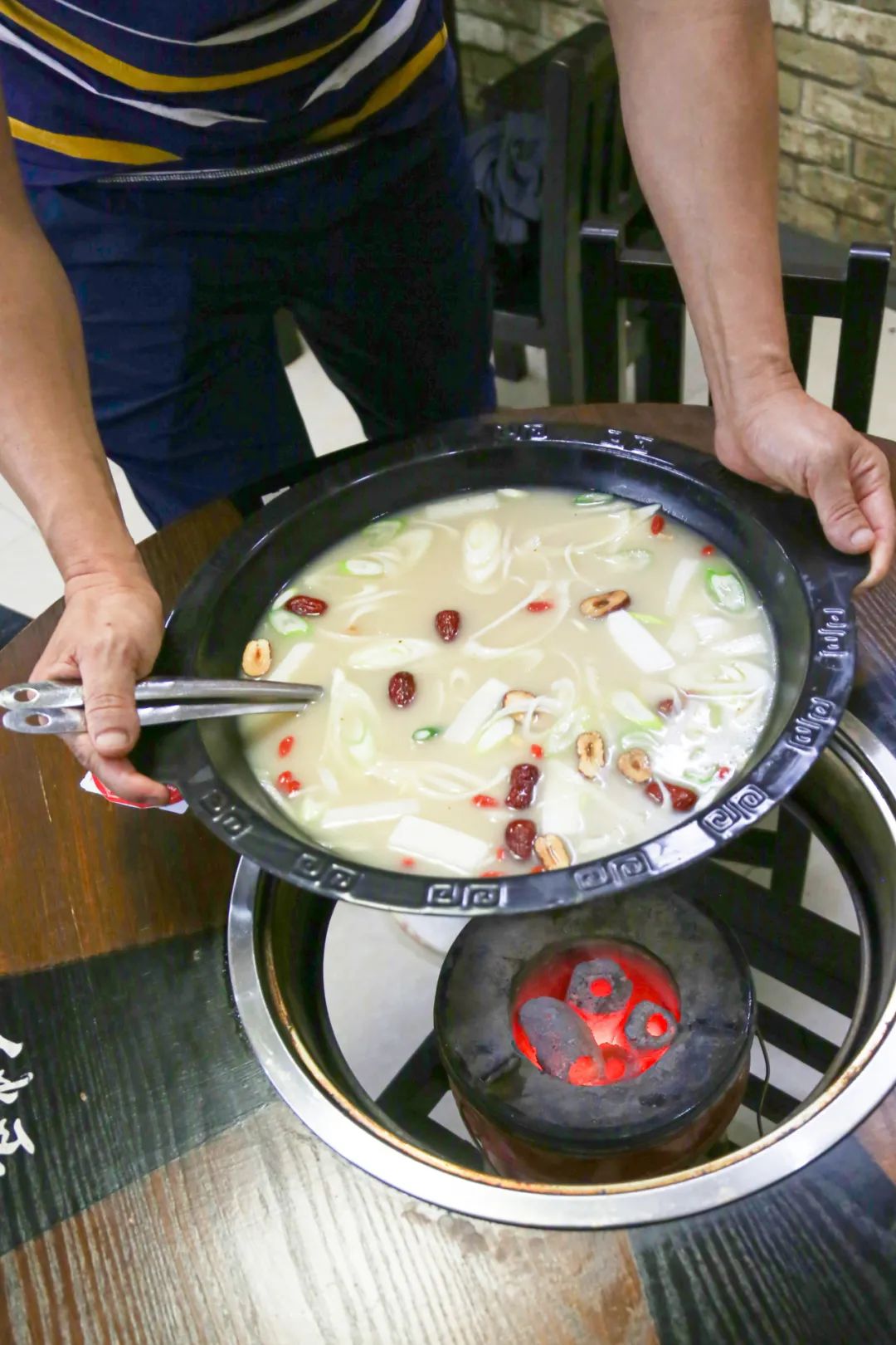 店里主打特色的碳锅带皮羊肉,一经上线便深受顾客喜爱,“两天不喝想得慌”是对它最高的评价。升腾着热气的羊汤锅一经端出,便吸引所有人的目光。在炭炉上滚沸着的羊汤,白如脂、亮似奶,点缀着鲜红的枸杞和红枣,令人食欲大增。