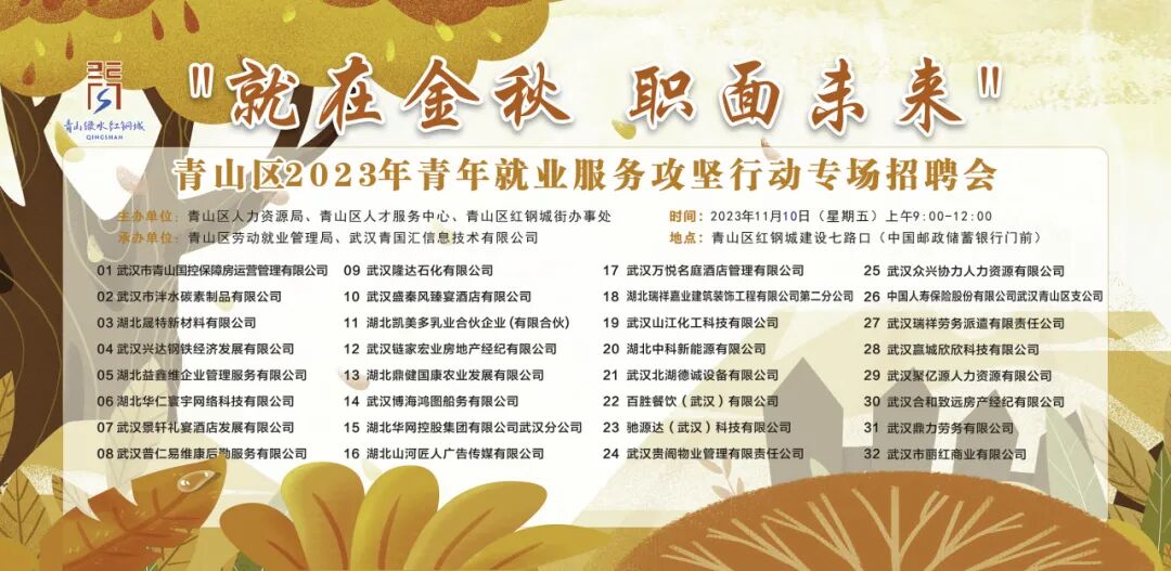 本次招聘会按照省、市统一部署,由青山区人力资源局、青山区人才服务中心、青山区红钢城街道办事处联合主办,青山区劳动就业管理局、武汉青国汇信息技术有限公司承办,以区内用工企业及离校未就业高校毕业生等青年就业群体为重点服务对象,同时面向有用工需求的各类用人单位及就业困难人员、失业人员、脱贫劳动力、长江禁捕退捕渔民以及其他有就业创业意愿的劳动者,保障青山区企业用工需求,为广大求职人员提供更多就业机会。