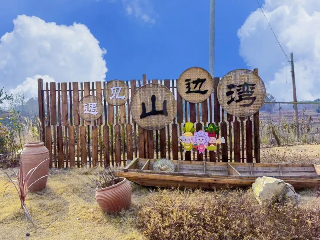 从进湾开始,就不时有一些独特的标识和物件映入眼帘,譬如用簸箕制作的“将军书屋”指示牌和“遇见山边湾”的宣传文案,“美丽乡村”墙体彩绘,路边特设的石碾子和小渔船等等,颇具农耕文化和乡土风味特色。