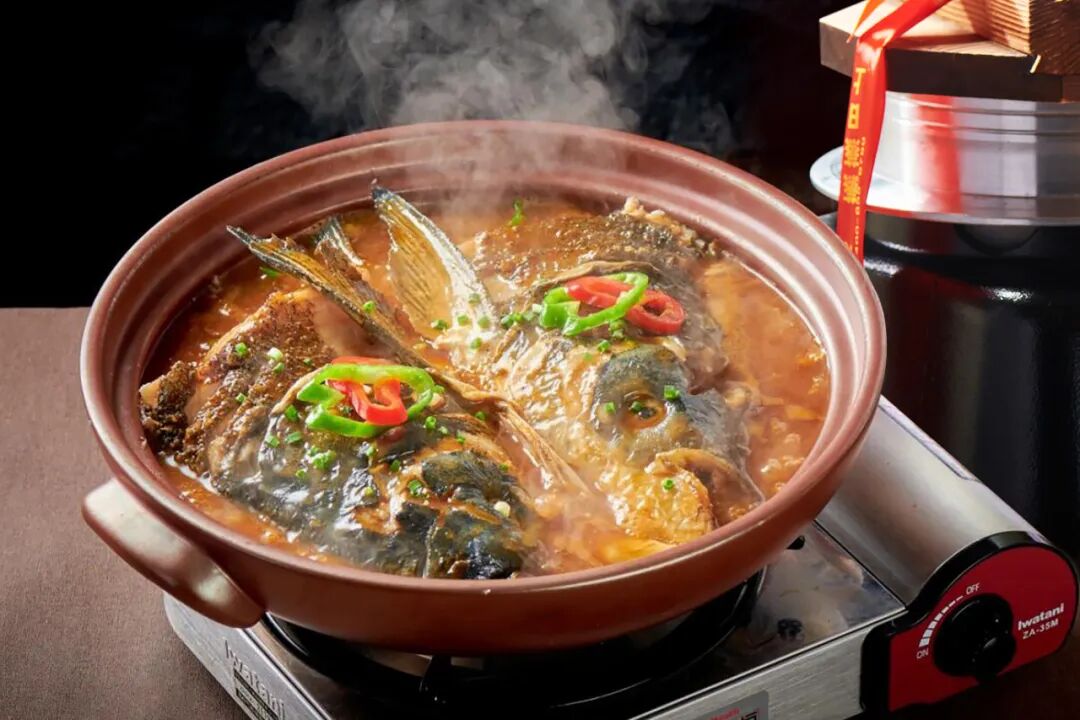 秘制鱼头王是“镇店之宝”,采用新鲜的有机雄鱼头,搭配花甲和日式豆腐,再加上秘制的酱料,鱼头入味鲜嫩,让你的味蕾在一瞬间爆发;花雕东坡肉皮薄肉嫩,色泽红亮,入口即化,搭配鹌鹑蛋,香而不腻;老谭酸菜财鱼则选用新鲜的鱼肉切成均匀的薄片,搭配上酸菜提鲜的味道,兼具了酸菜的酸爽和鱼肉的鲜美;筒子骨藕汤经慢火煨制,肉烂藕粉,汤汁鲜美。