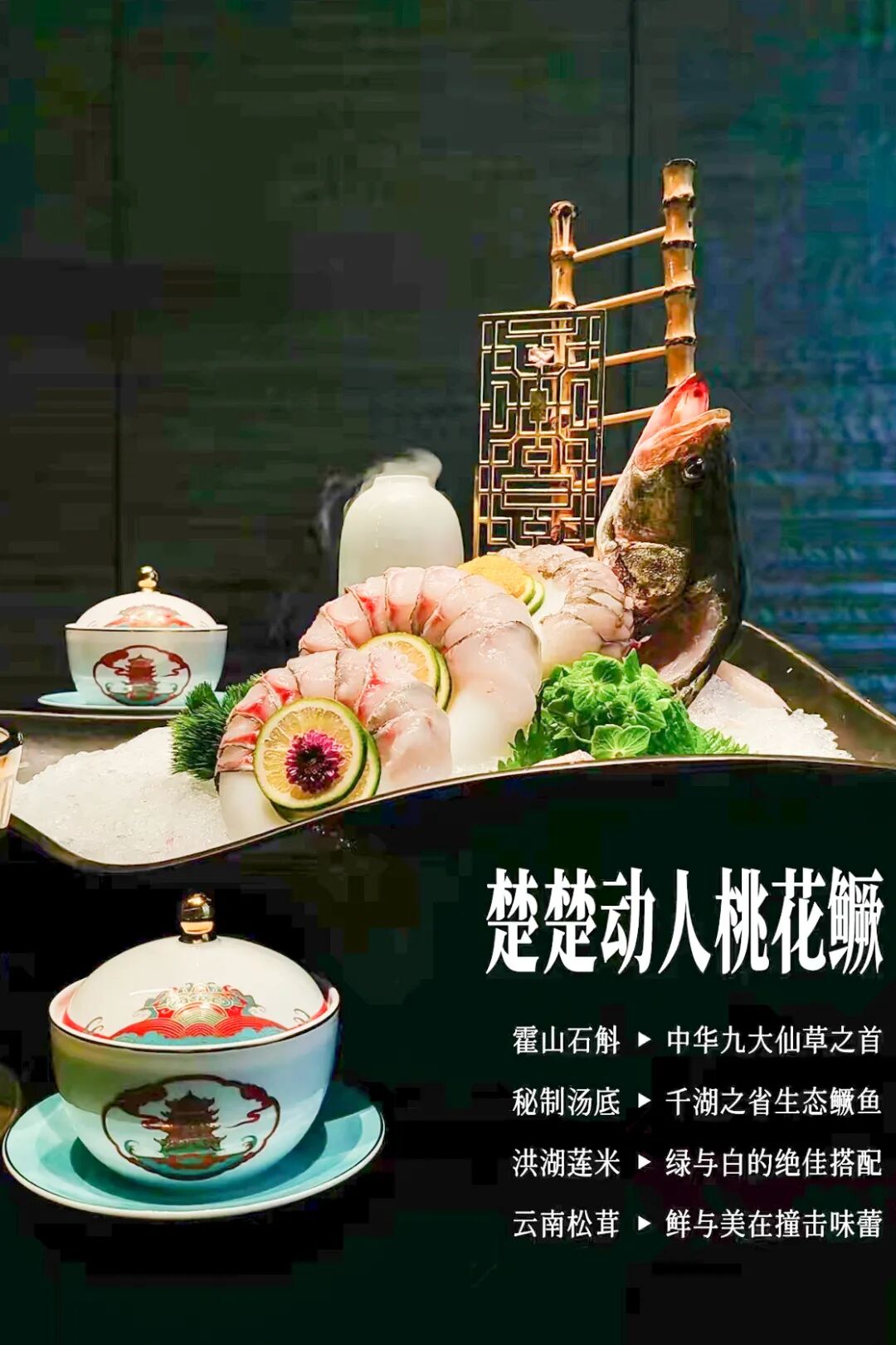 荆荆有味跳墙来,2300年前,屈原在《楚辞 招魂》中写道:“胹鳖炮羔。”甲鱼也数次登上楚国国宴的名单。佛跳墙与历史悠久的楚国国宴菜碰撞,每一口都是文化的传承与时代的创新。楚楚动人桃花鳜,选用千年仙草霍山石斛秘制汤底,冲浪千湖之省生态桂鱼,再加入洪湖鲜莲米,富硒葛仙米和时令云南松茸,富含天然的营养和独特的滋补功效,是食补之佳品。