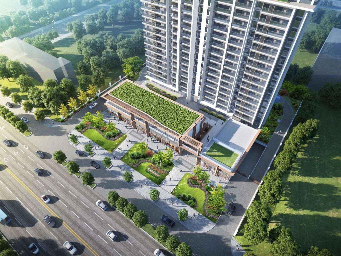 “立体花园”式绿化就是其中一项重要设计。杜中丽介绍,21街项目地块小,6400平方米的面积上建起一栋住宅楼及裙楼,地面绿化空间已十分狭窄。在地面、屋顶、架空层见缝插针设置绿化,整个项目绿化面积能超过30%。