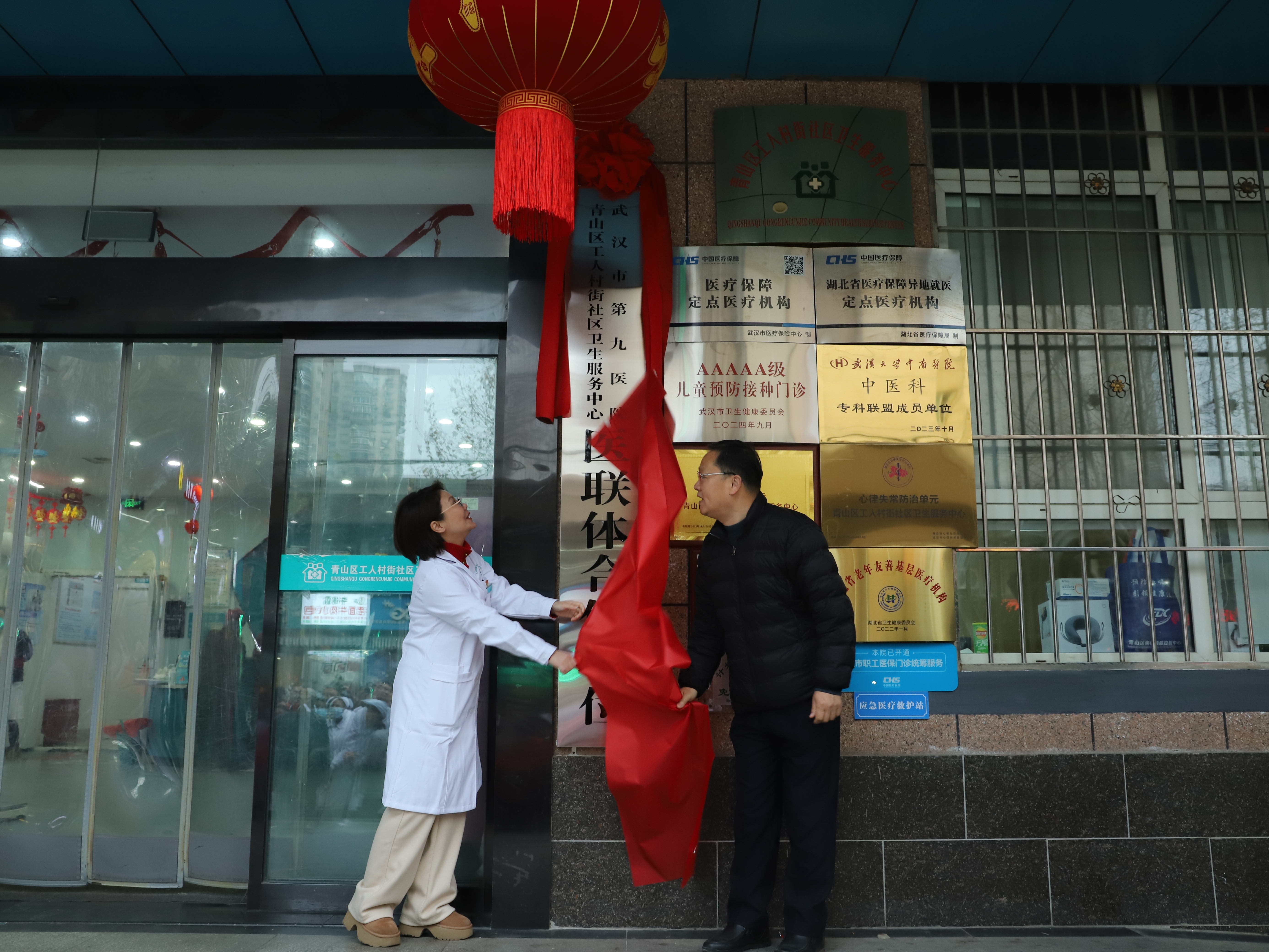 上午9点,工人村街社区卫生服务中心门前,武汉市第九医院负责人与工人村街社区卫生服务中心负责人共同为医联体合作揭牌。