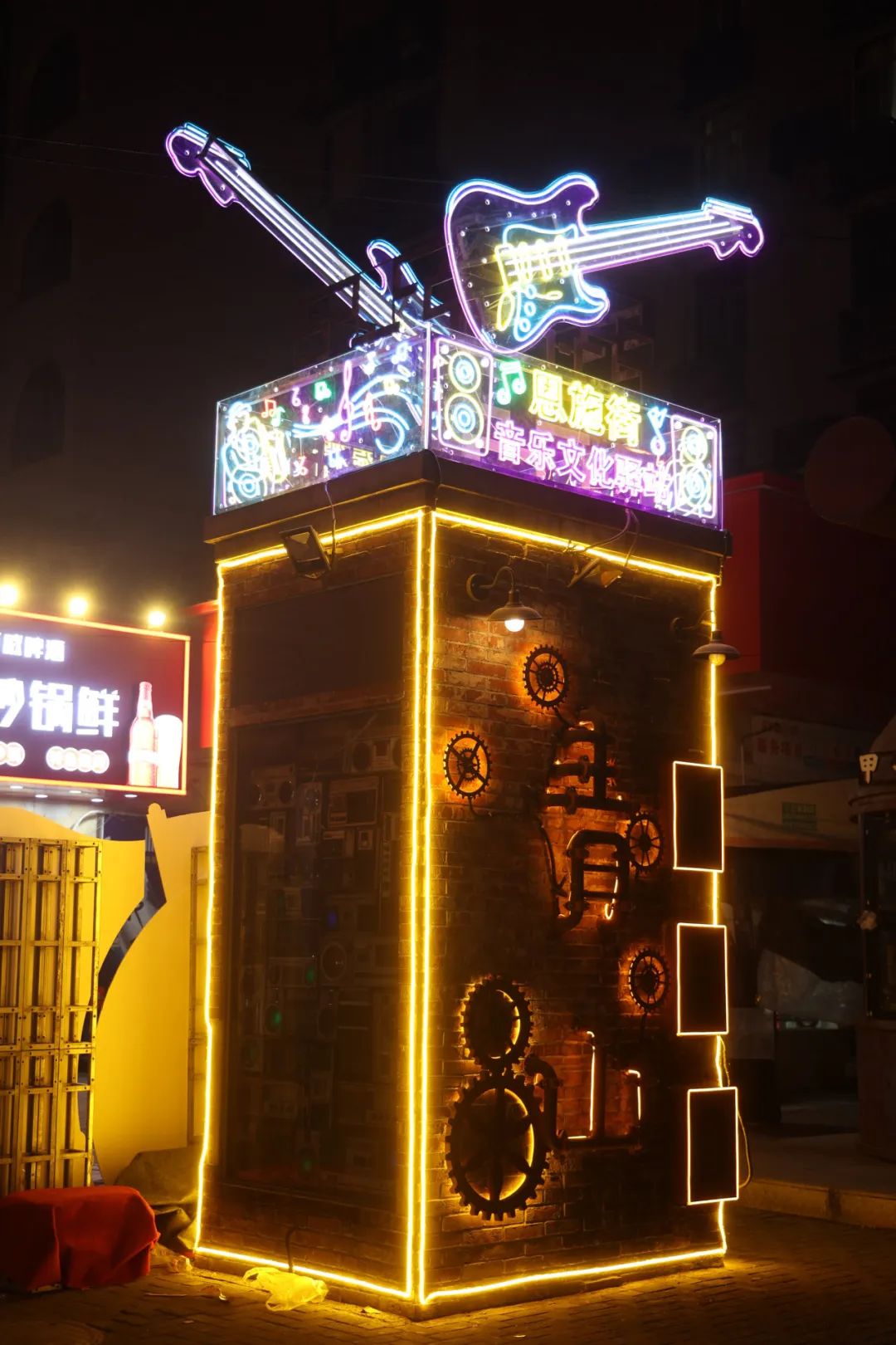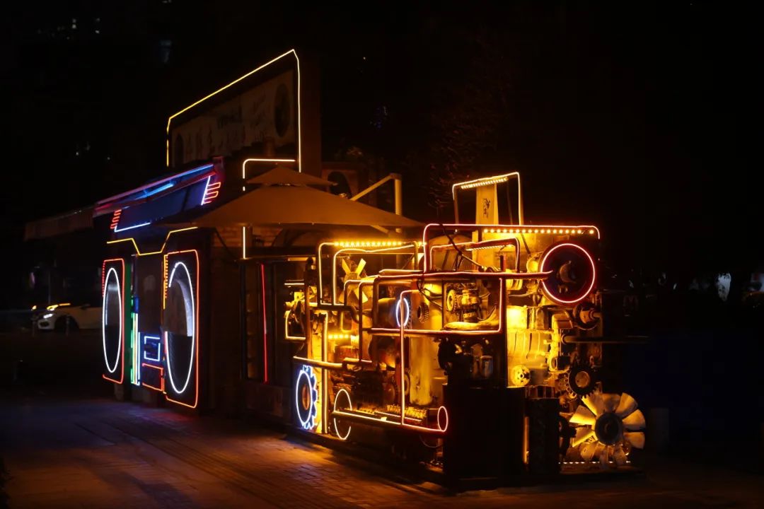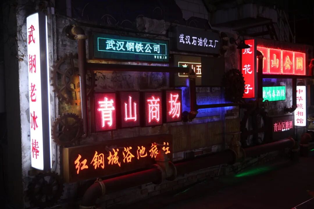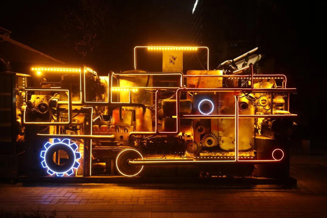 本次提升改造由青山国投集团青国融公司负责,涉及街区11处点位亮化翻新,以赛博朋克为基础风格,利用彩色灯带,霓虹灯牌、发光图案打造了赛博蒸汽机、收音机、音乐驿站等多种灯组造型,炫目的彩灯将青山区的特色工业元素与潮流二次元文化进行碰撞,孕育出别具一格的街区风貌。