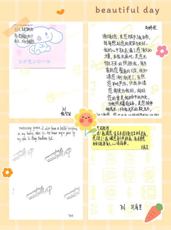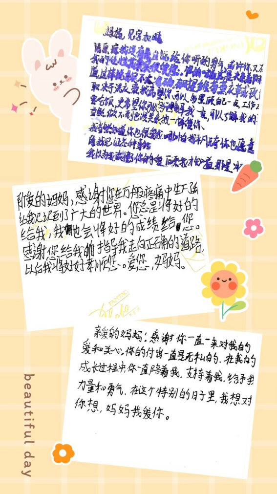 接到这项任务,同学们热情高涨,纷纷行动起来,或亲自制作卡片,或用自己的零花钱买一张贺卡,写满了对妈妈的爱。701班邹浩然同学在贺卡中感谢妈妈平时的辛苦和操劳,并立志努力学习,成为妈妈的骄傲。701班谢可欣同学手绘贺卡说,能成为妈妈的女儿是非常幸运的,感恩了妈妈的养育之情。