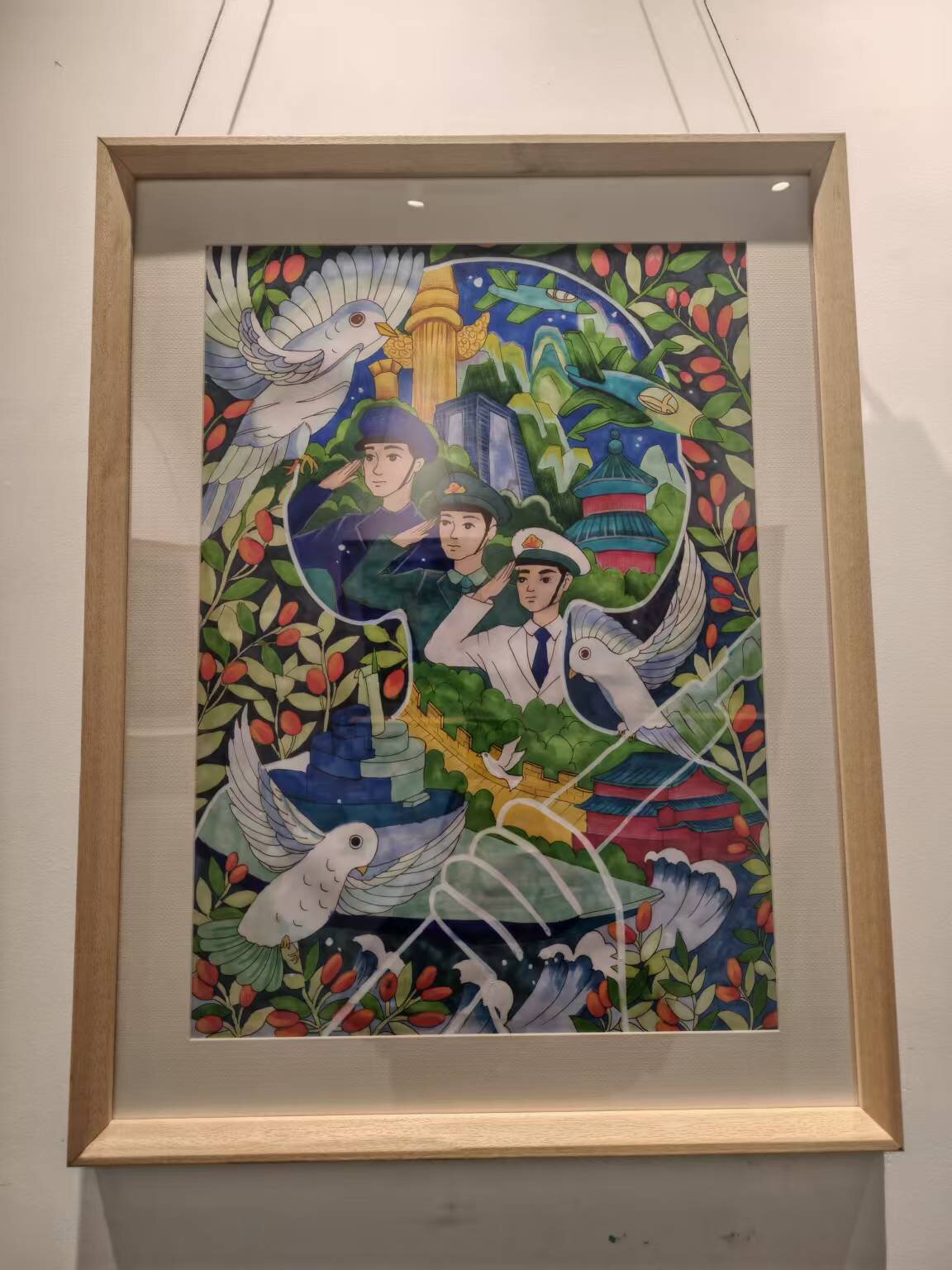 以军人与和平鸽为主题的绘画作品,通过刚劲的笔触勾勒出军人守护的姿态与和平鸽展翅的意象;以不同职业人群围成同心圆的剪纸作品,通过刀工细腻的镂空技法,环环相扣展现工人、医生等职业形象,其紧密相连的剪影姿态,恰似编织一张守护家国的安全网;以“校园亦是主战场,安全意识伴成长”为主题的书法作品,则借助苍劲有力的笔法,将“校园战场”的庄严感与“安全成长”的温润意境融于上下联的墨韵之中……