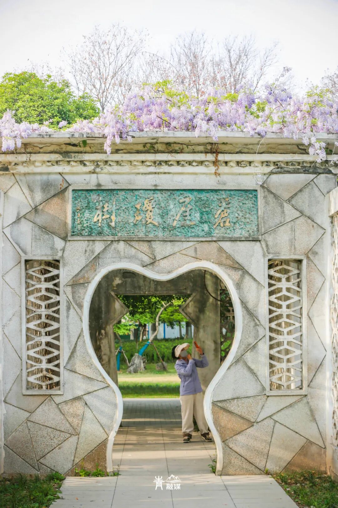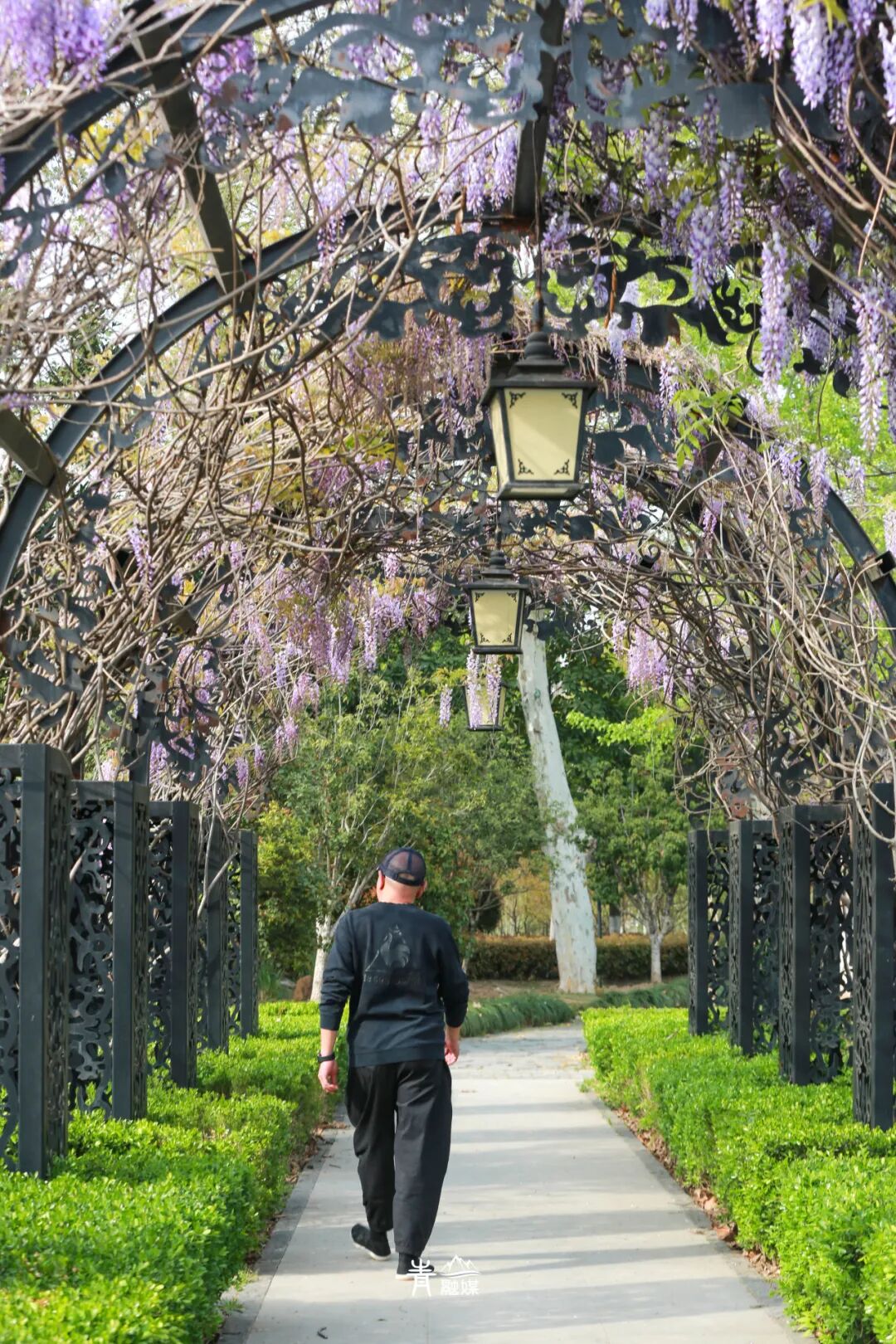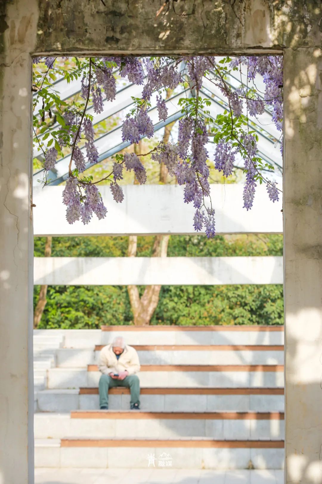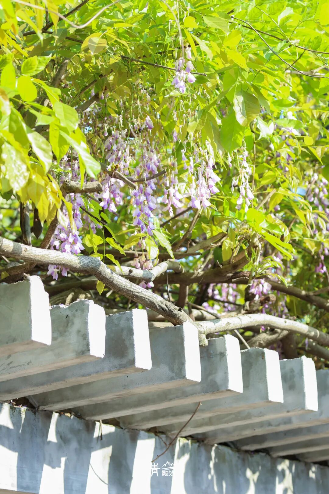 坐于长廊上的长椅,头顶是如瀑布般倾泻而下的紫藤花,阳光透过枝叶的缝隙洒下,形成一片片金色的光斑。古香古色的长廊是天然的拍照背景板,快来紫藤花下感受春天的浪漫,定格春天吧!