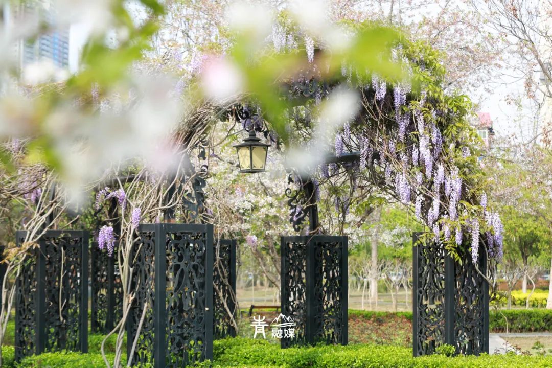 梦幻紫藤长廊再度准时“上线”啦!在江湾湿地公园儿童乐园里,拱形长廊上的紫藤在廊檐下织就层层叠叠的帘幕,映照着无限美好的浪漫,撩拨着游人赏景的芳心。