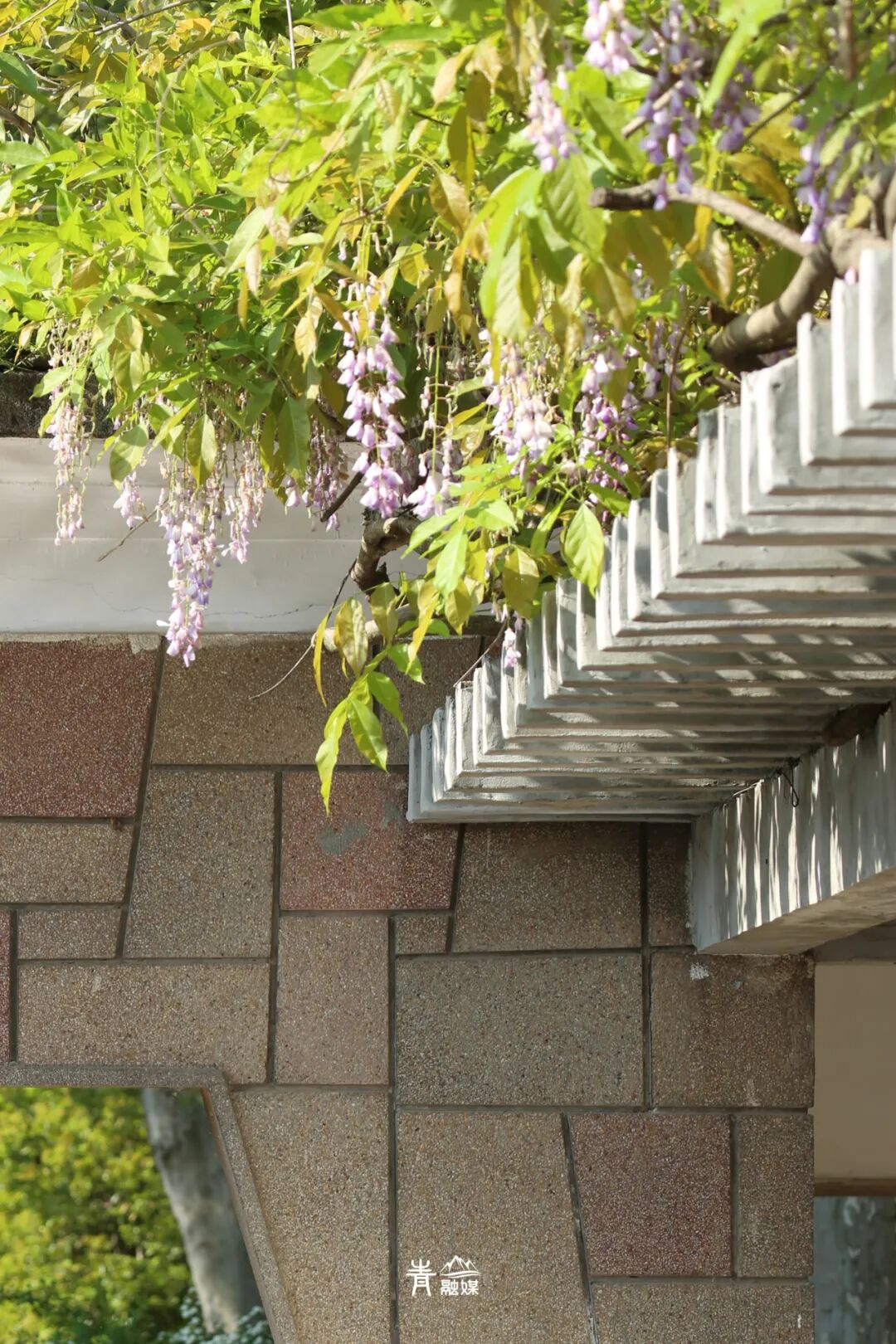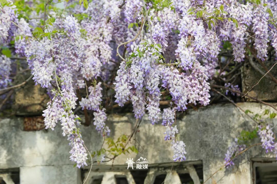 一大片紫藤借着斑驳的墙体和梁架,自由伸展着曼妙身姿,在绿色枝叶的掩映下,呈现出一派朝气蓬勃的景象,犹如一串串春天的绮梦倾斜而下。走进了细瞧,饱满的花穗又像一串串紫色葡萄,惹人垂涎。