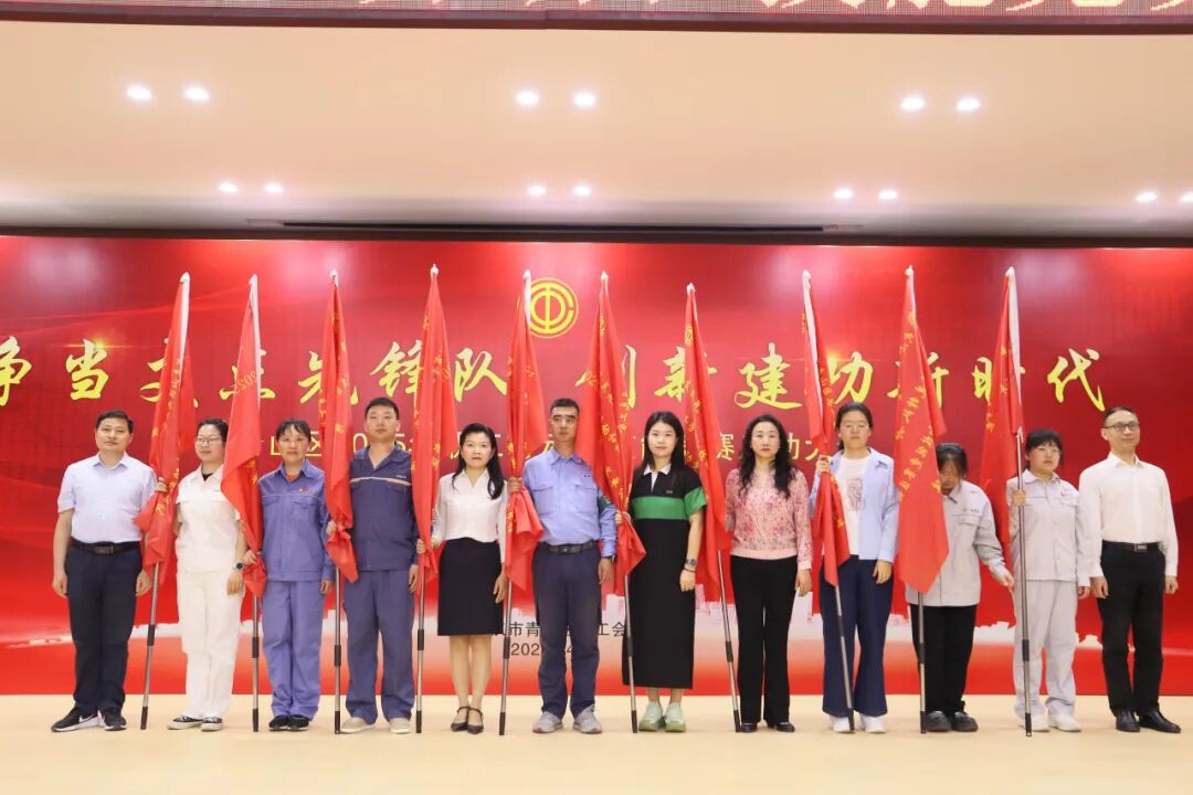 在激昂的礼乐声中,与会市、区总工会领导为10家2025年劳动竞赛参赛单位代表授旗,飘扬的旗帜将现场气氛推至高潮。随后,青山区2025年职工劳动和技能竞赛正式启动。
