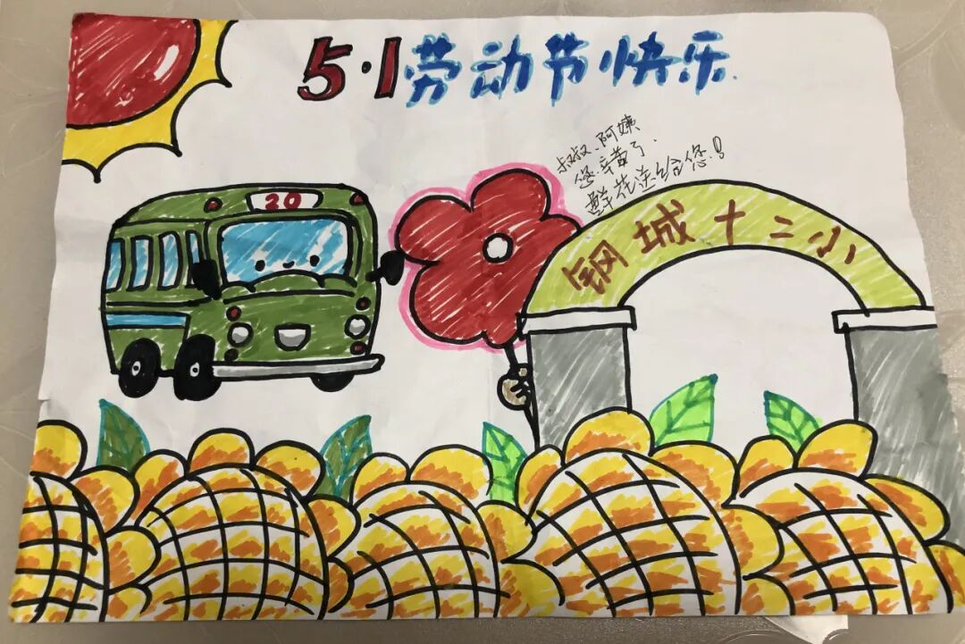 “叔叔、阿姨,您辛苦了,鲜花送给您!劳动节快乐!”展开画作,稚嫩的字迹跃然纸上。画中,栩栩如生的20路公交车正稳稳驶向钢城十二小学校门,一只小手紧紧握着鲜艳的小红花。寥寥几笔,勾勒出孩子心中最温暖的画面。