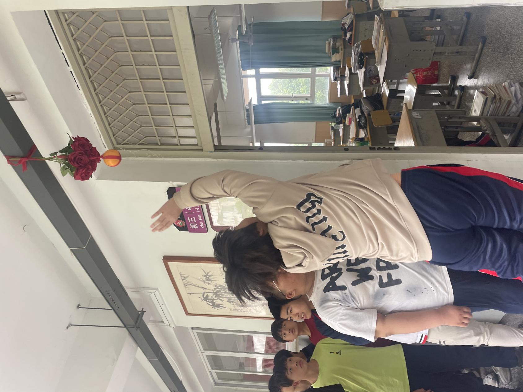 在充满仪式感的餐点发放环节,同学们依次跳跃至挂花束处,与班主任击掌并互动。尤其初三(3)班张丹老师更是别出心裁,用华丽丽的“化学语言”给学生注满能量,而且与“粽”不同。当3班卻德震跳起击中花束,张老师花式送上“分子,原子,天选之子”“持久力,爆发力,做题给力”“起跑线,终点线,全过录取线”……学生围在老师身边,脸上洋溢着幸福的笑容。