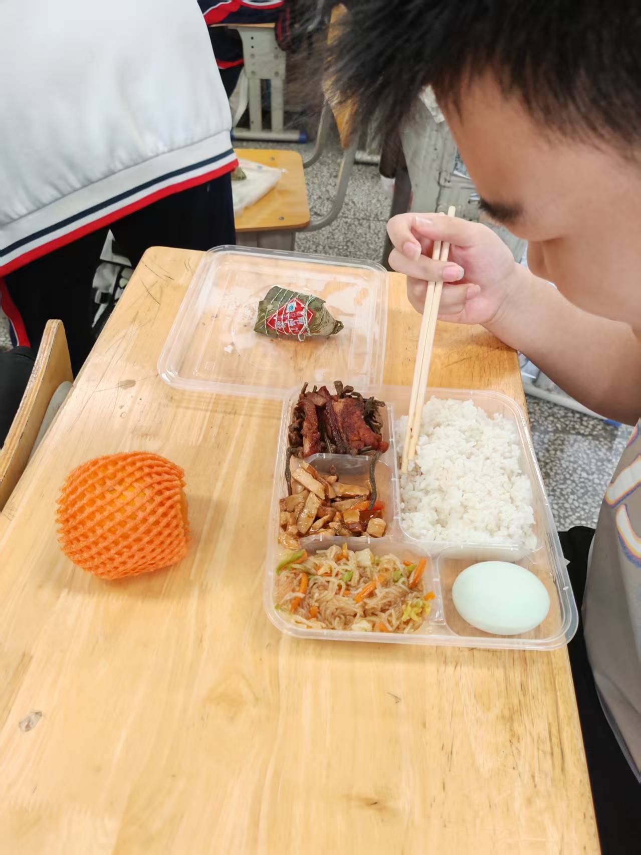 “同学们,抛开课本,让我们开启欢乐时光!”随着班主任热情洋溢的开场白,活动在轻快的背景音乐中拉开帷幕。讲台上,寓意“与粽不同”的端午特色餐(粽子、咸鸭蛋)与象征“前程似锦”的果冻橙整齐摆放,传递着学校对学子的美好祝福。
