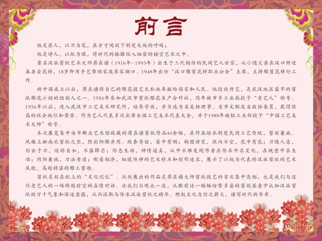 本次展览首次集中展出由武汉市群众艺术馆珍藏的蒋在谱先生40幅经典剪纸作品!现场展柜里同时还展出蒋在谱大师的再传弟子、青年剪纸艺术家、剪纸收藏家葛海先生的上世纪蒋老留存实物及珍稀剪纸作品,整个展览一直延续到7月13日。