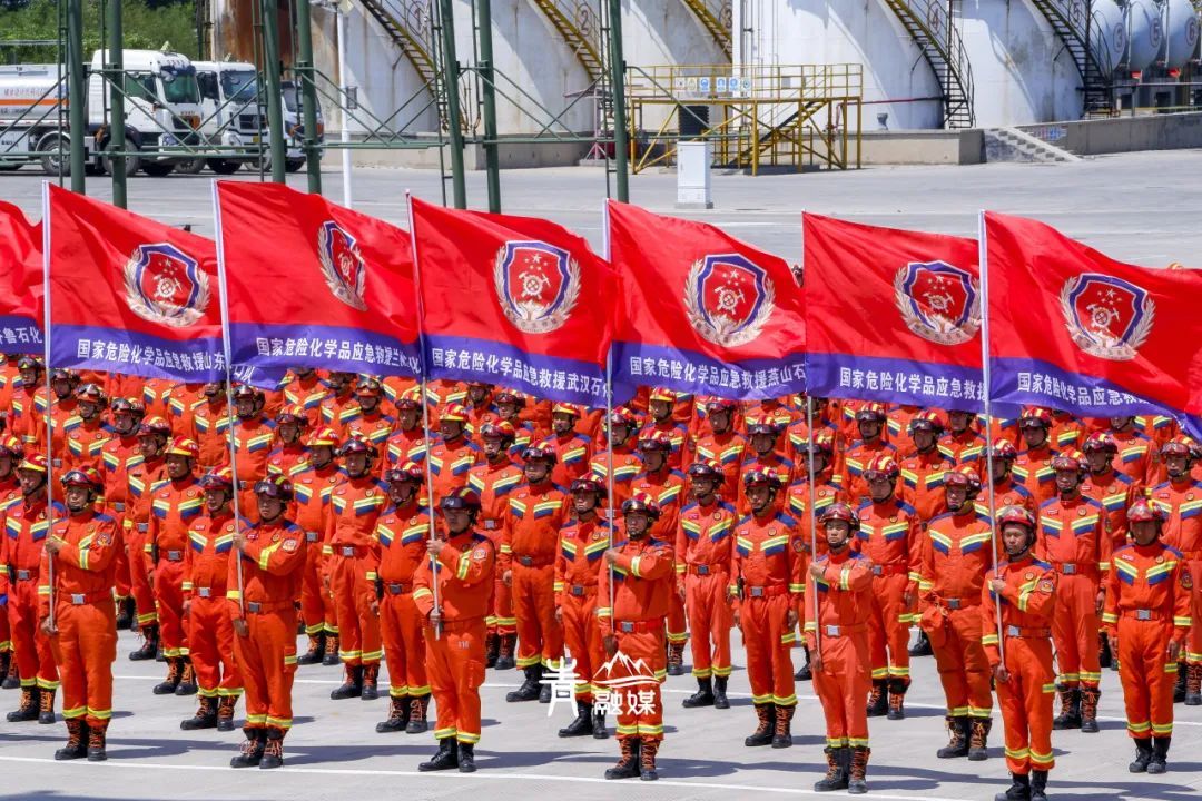 在河南濮阳国家危化品应急救援实训基地举行的大型储罐火灾爆炸事故救援专题演练中,模拟雷击导致大型储罐着火。来自全国的19支国家危化品应急救援队伍、638名指战员投入实战。其中,国家危化品应急救援中原油田队、武汉石化队等8支中国石化系统应急队伍精锐尽出,以精湛技能直面挑战。