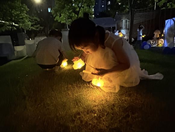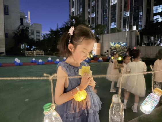 孩子们用塑料瓶制作许愿瓶,将闪灯串成星河装入瓶中。夜幕降临时,孩子们踮脚将缀满灯光的许愿瓶挂在操场树梢。暖黄微光透过瓶身流淌,像撒落一地的星星碎片。