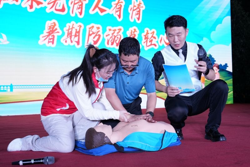 活动邀请青山区红十字会专业老师上台生动讲解防溺水知识,现场实操示范自救互救、心肺复苏等关键技能,并在志愿服务区搭建了专业的“应急救护知识加油站”开展“手把手”的实操教学。