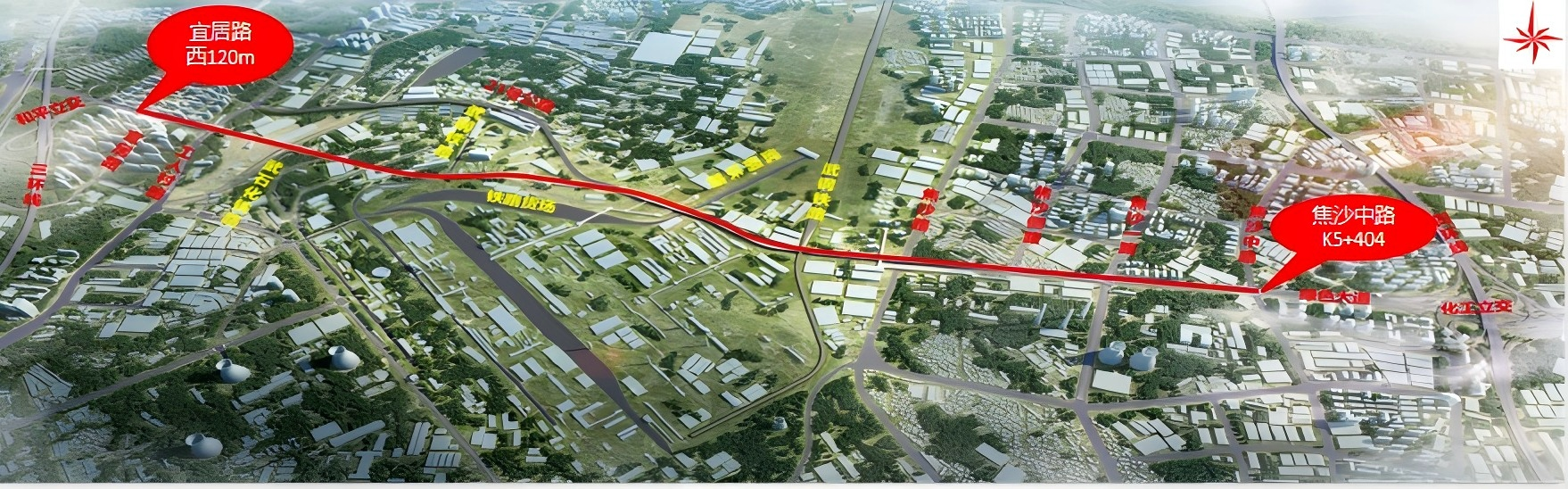 项目主线高架跨越地铁五号线工人村车辆段及武石化铁路专用线,设计采用双转体斜拉桥,全长703米,桥宽33.5—34米,塔高115.8米。