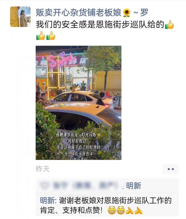 “有他们在,咱们商家做生意都安心多了。”黄先生说。“我们每晚7点到12点开展不间断巡逻,整条街的商户都有我们的联系方式,遇到问题他们会第一时间向我们求助,我们也会尽快到场处置。”晚上10时,恩施街的体感温度达到33℃,李新伟和队员们的衣服也被汗水湿透。有店家掏出手机拍下民警们的背影,发到朋友圈、抖音并配文:“我们的安全感是恩施街步巡队给的。”
