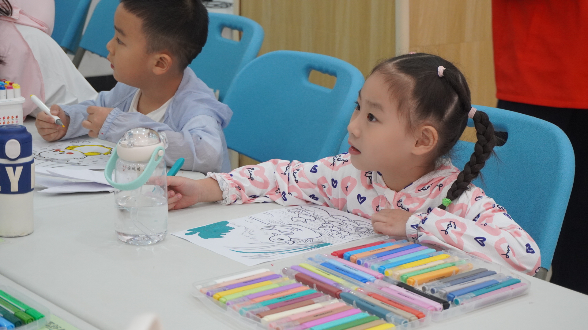 孩子们拿起彩笔为水鸟填色。 实习生 吴瑶摄