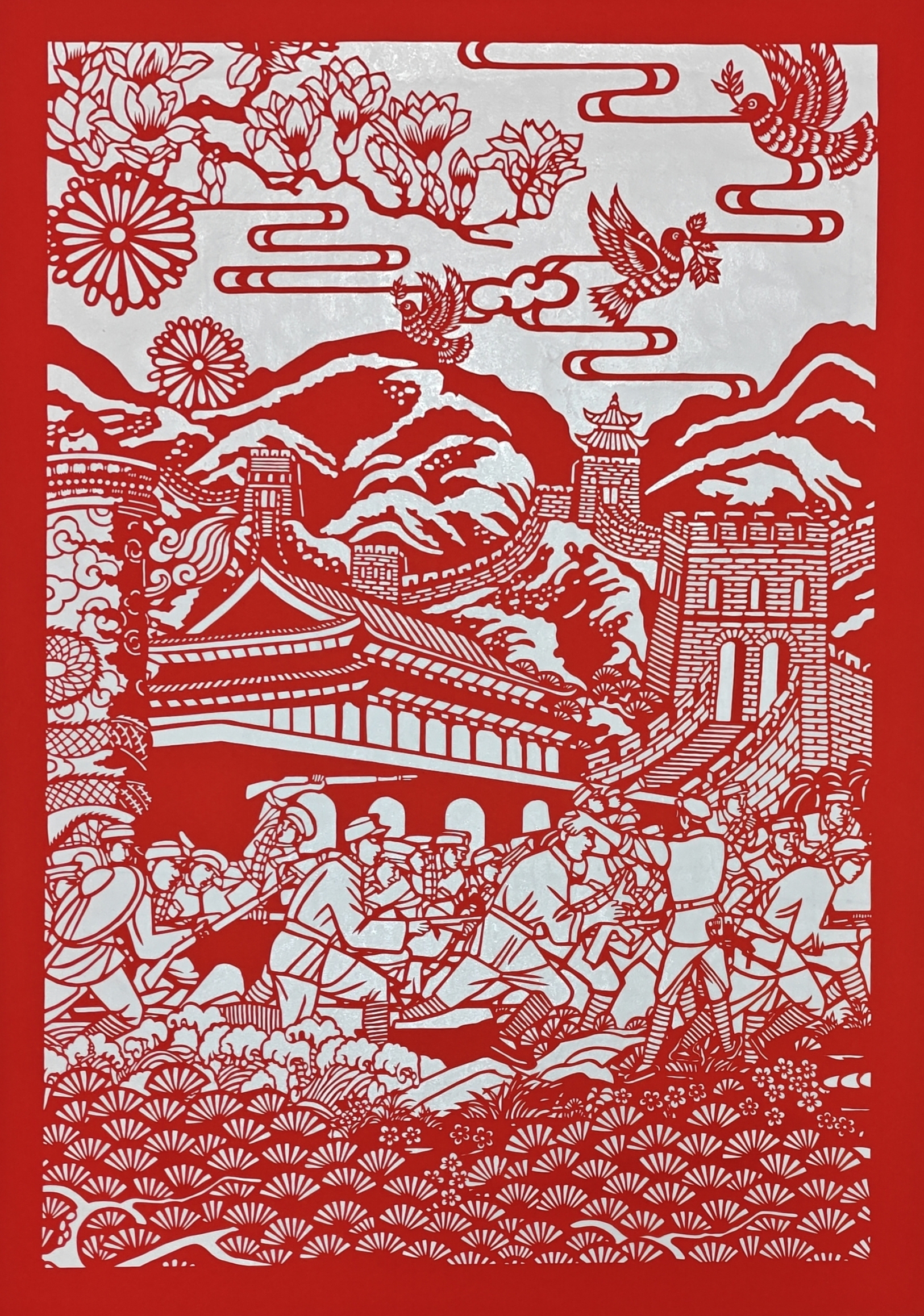 此次展览以非遗技艺为媒介,创新诠释抗战历史。省级非遗代表性项目“武汉剪纸”传承群体,倾力打造众多原创剪纸作品《军歌嘹亮》《万剪八秩史·民族脊梁颂》,更以《抗日小英雄》《大刀颂》等场景展现军民同心抗敌的壮烈画卷。武汉剪纸传承人沈松柏、江先孝、毛明月团队早在2021年中国共产党成立100周年之际,就与八路军武汉办事处旧址纪念馆联合开展原创展览《传承红色文化 讲好革命故事——全民抗战剪纸作品展》,今年再次深入挖掘史料,确保作品既是艺术创作,亦是历史见证。