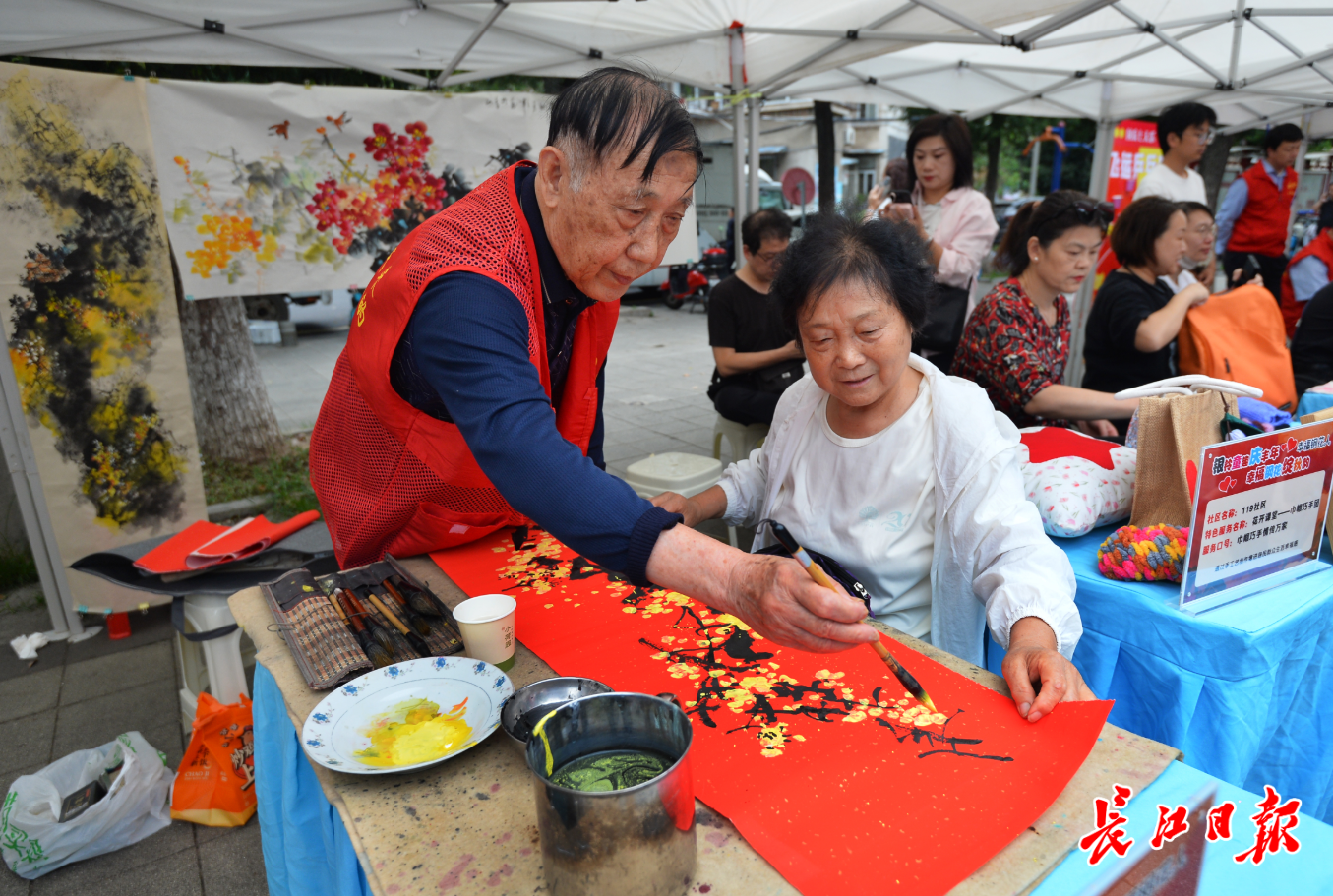 钢花村街道北苑社区民间书画家鲁久军先生现场挥毫泼墨,表达长江日报社区行走进基层的喜悦之情。