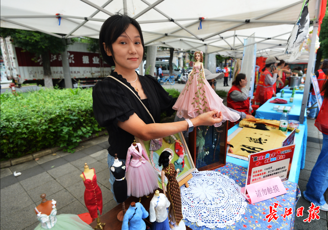 钢花村街道110社区的“娃娃衣设计师”张晓静在现场展示她的作品。