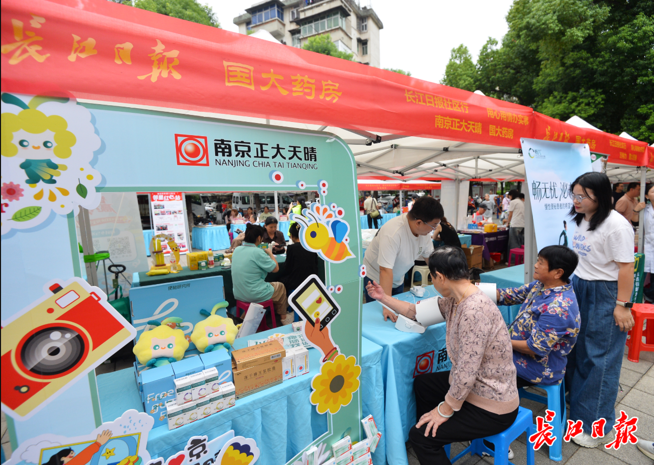 在健康关怀区,国药控股湖北国大药房有限公司携手十余家药企为居民送服务。南京正大天晴药业为居民提供免费血糖、血压检测,并赠送香皂;复星万邦则开展免费血糖、尿酸检测,并派发纸巾、扇子、漱口水等百余份实用福利,吸引众多中老年居民排队参与。