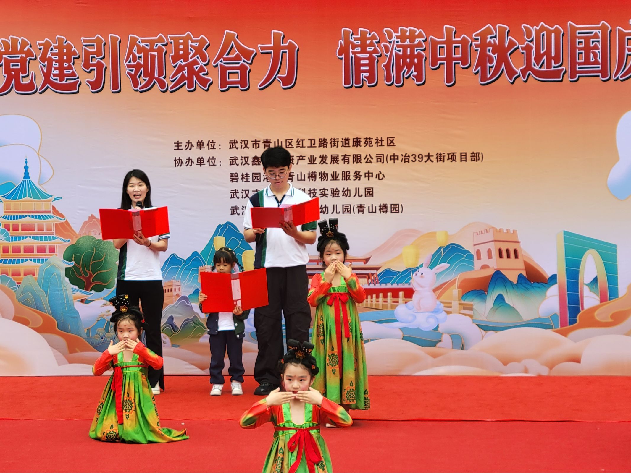 大班幼儿走进社区,带来“童声颂祖国,明月照童心”文艺汇演。小小主持人自信昂扬,节目精彩纷呈,在掌声中传递爱国情怀与传统文化魅力。