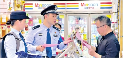 青和居警务团队联合英模背包服务队上门对商户进行反诈宣传。青山公安供图