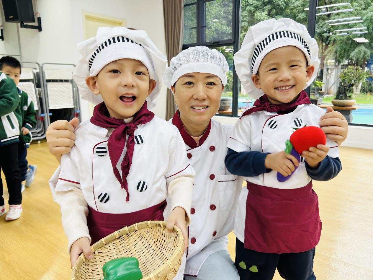 “切萝卜,炒青菜……”随着《蔬菜进行曲》欢快的节奏响起,萌娃们在老师的带领下,先来了一场“岗前培训”。小手握着玩具锅铲,一本正经地练习“翻炒”;手腕一转一转,模仿切菜的动作。教室里满是忙碌的小身影,每个孩子都在音乐中认真练习着属于自己的“厨艺”。