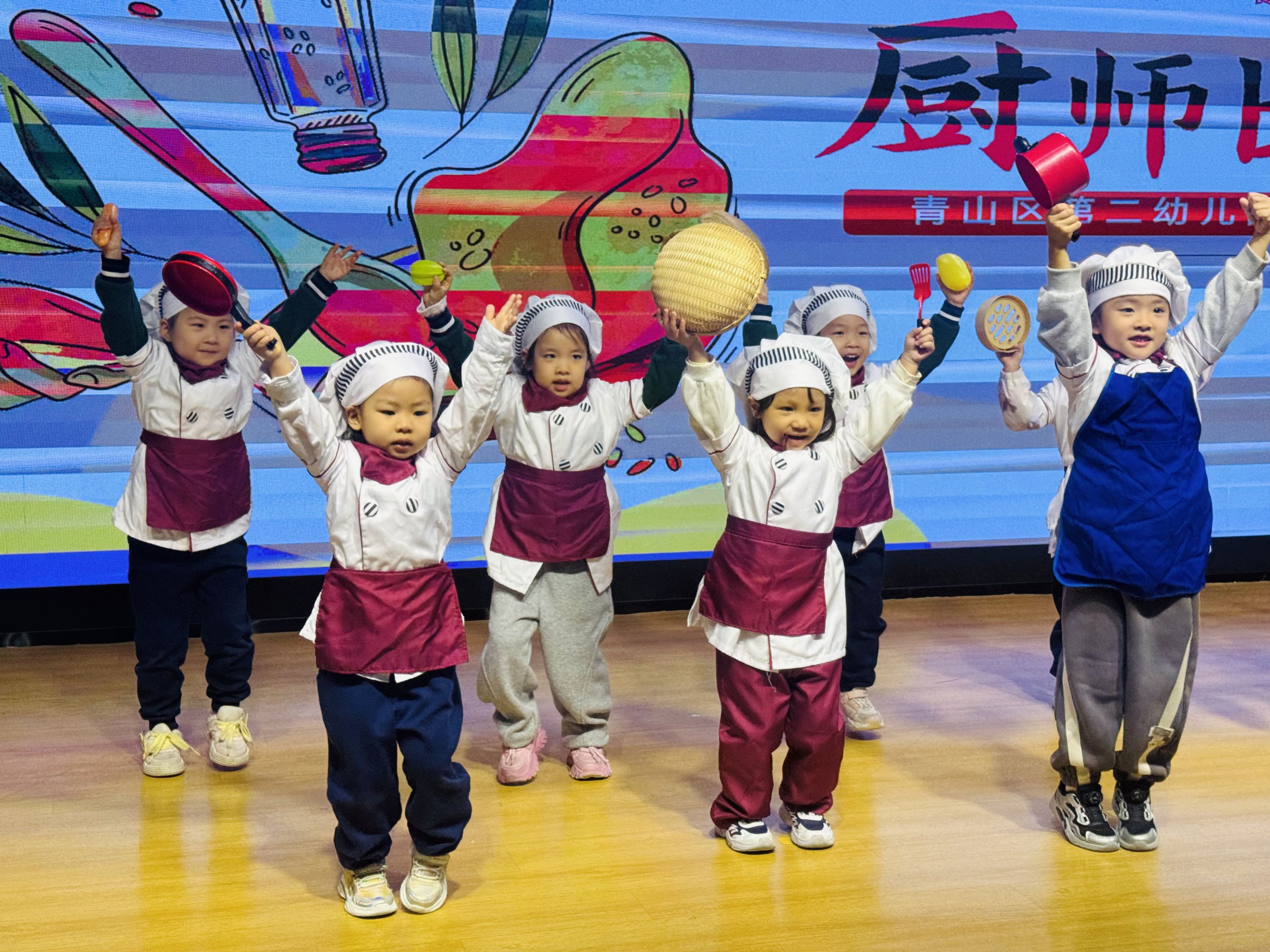 “岗前培训”结束后,孩子们戴好小厨师帽,要为厨房阿姨们表演节目啦。音乐响起,一双双小手跟着节奏挥舞起来,有的踮起脚尖转圈,有的模仿着炒菜的动作。虽然跳得不太整齐,但每个孩子都特别认真,小脸上满是专注。看着这群可爱的小厨师,厨房阿姨们都笑得合不拢嘴。