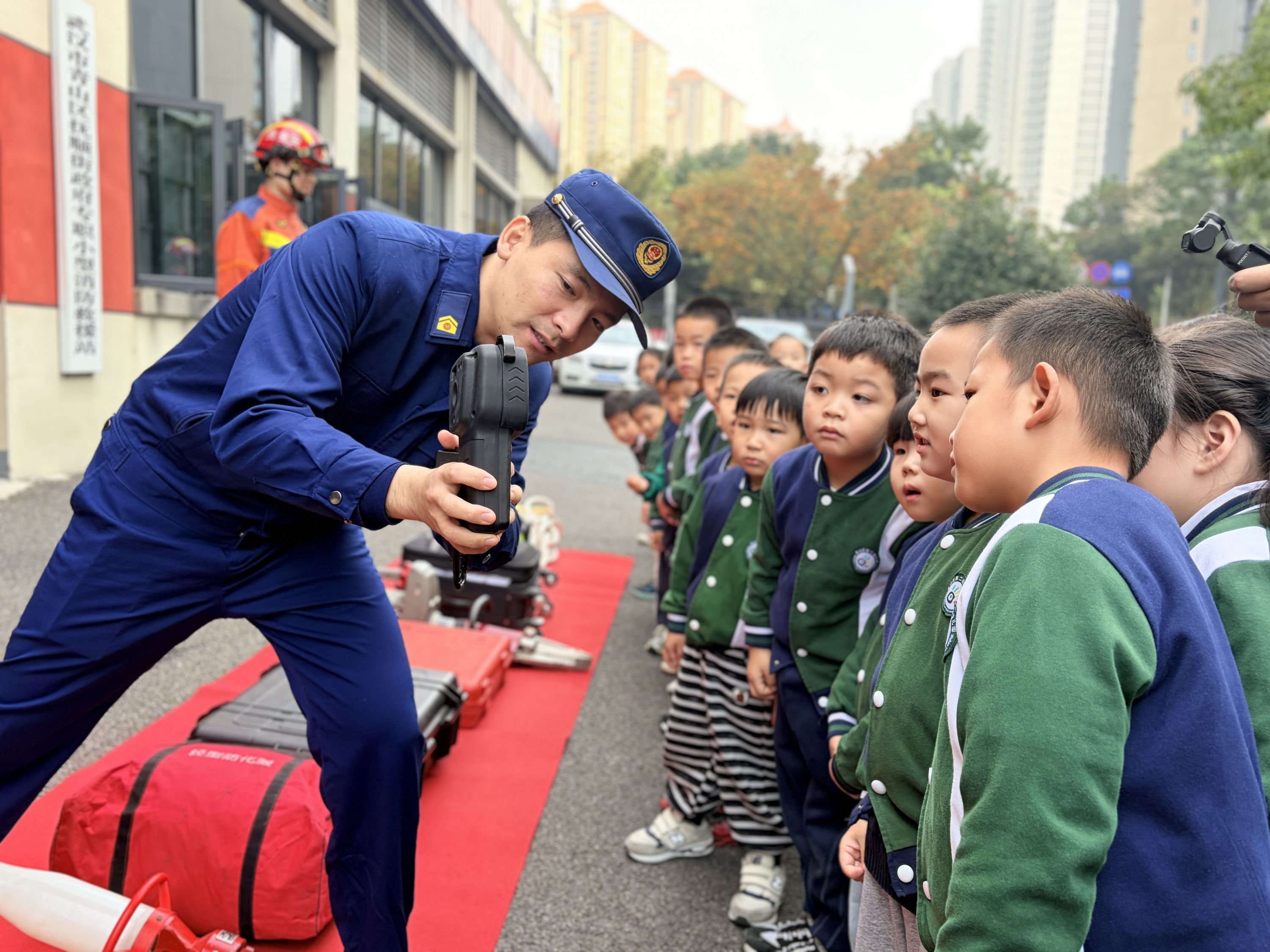 “消防车的水管能喷到天上吗?”“这个‘大钳子’能剪开铁门吗?” 活动一开始,孩子们就围着消防器材叽叽喳喳抛出一连串童趣提问。消防员担任起“安全知识翻译官”,将专业的装备化为生动的比喻 ——“这是消防车的‘高压水枪魔法棒’,能精准扑灭高处火情”“这是破拆工具‘大力士’,紧急时能开辟生命通道”。