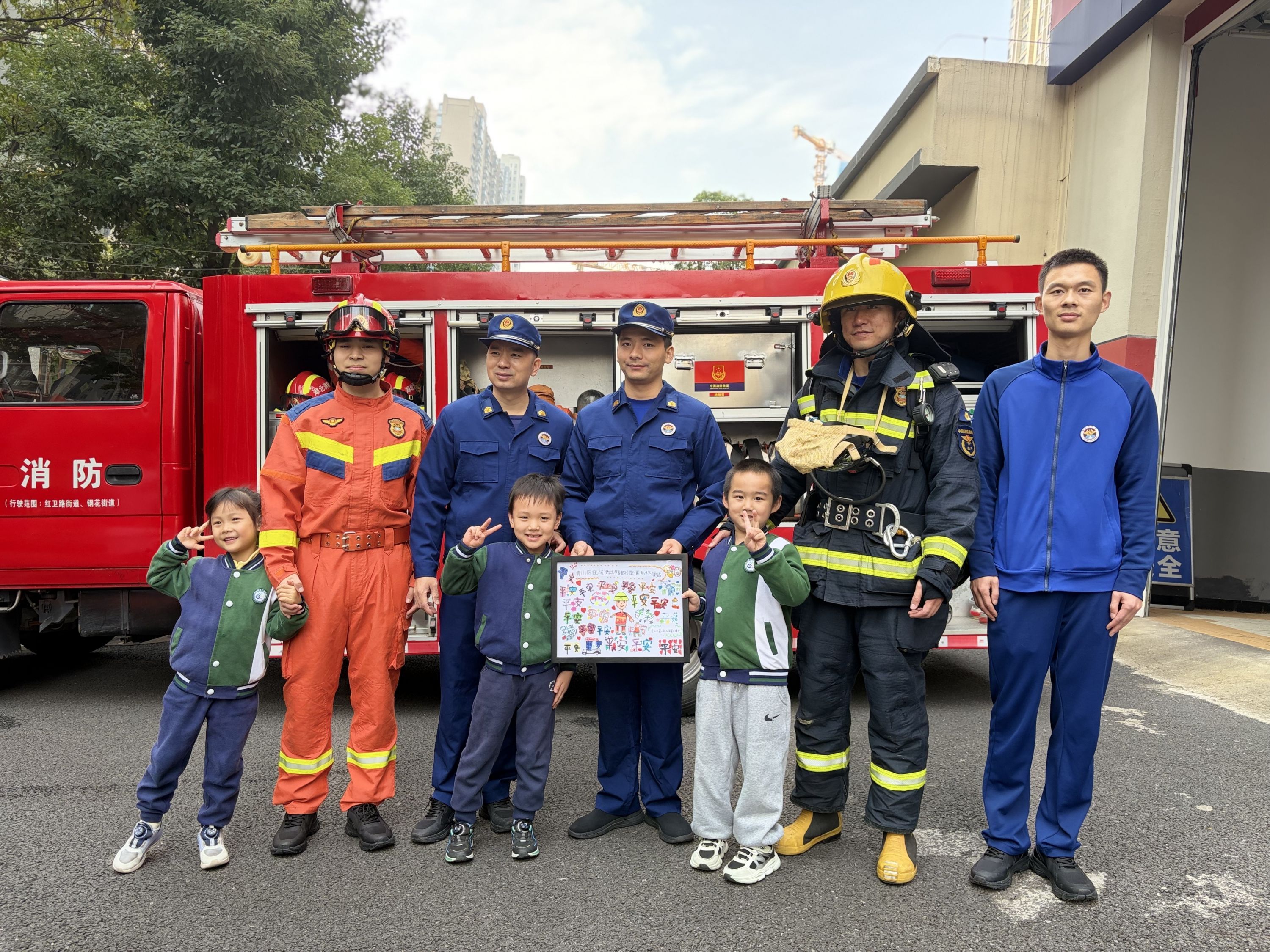 最让孩子们兴奋的是体验环节。在消防员的守护下,他们亲手握住水枪,感受水流喷射的力量,过足了“小小消防员”的瘾。这份新奇的体验,更化作了一份真挚的敬意。 活动尾声,孩子们将绘满“平安”符号和消防员形象的画作郑重递出。对“火焰蓝”的崇敬与消防安全的种子,已在这场趣味互动中深植童心。