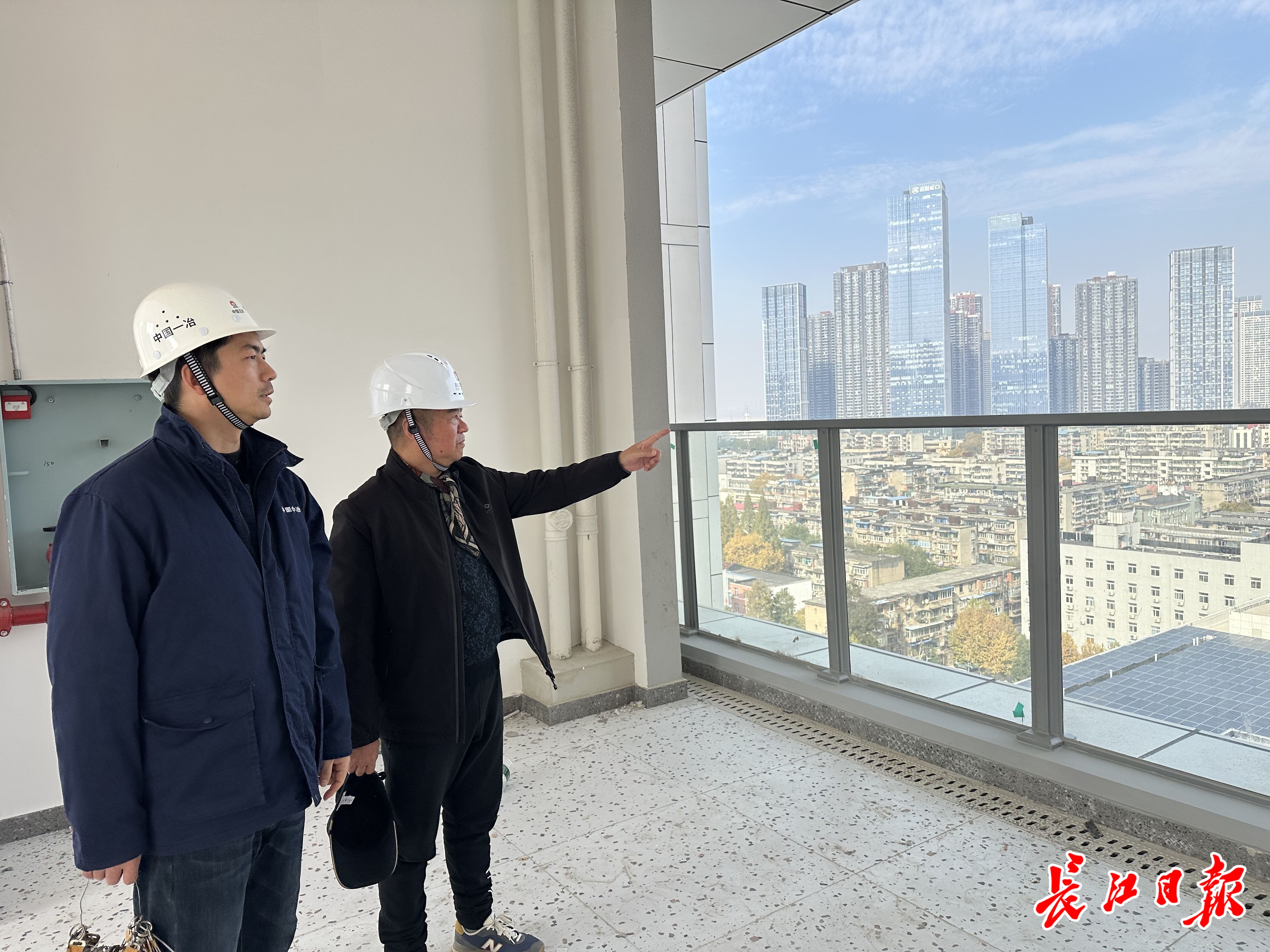 缪伟(右)站在空中活动层看外面的风景。记者张衡 摄